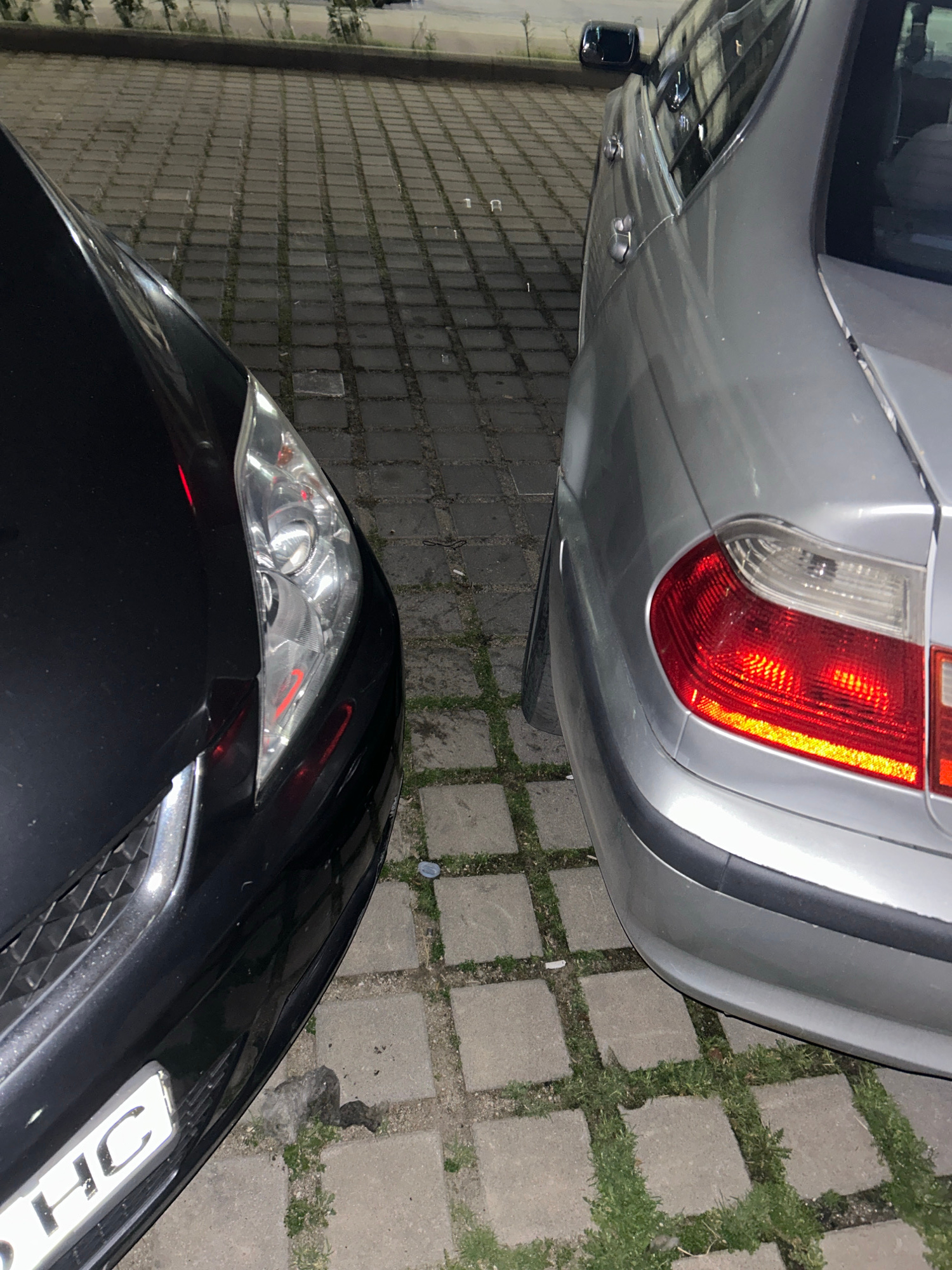 The image shows the rear of a silver car and the front of a black car parked on a paved surface with grass growing between the paving stones. The location appears to be an outdoor parking area. The si…read more