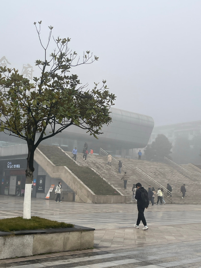 A foggy outdoor scene presents a tree in the foreground. Behind the tree, a modern building is partially obscured by the fog. People are walking up a set of stairs. The ground is paved and there's som…read more