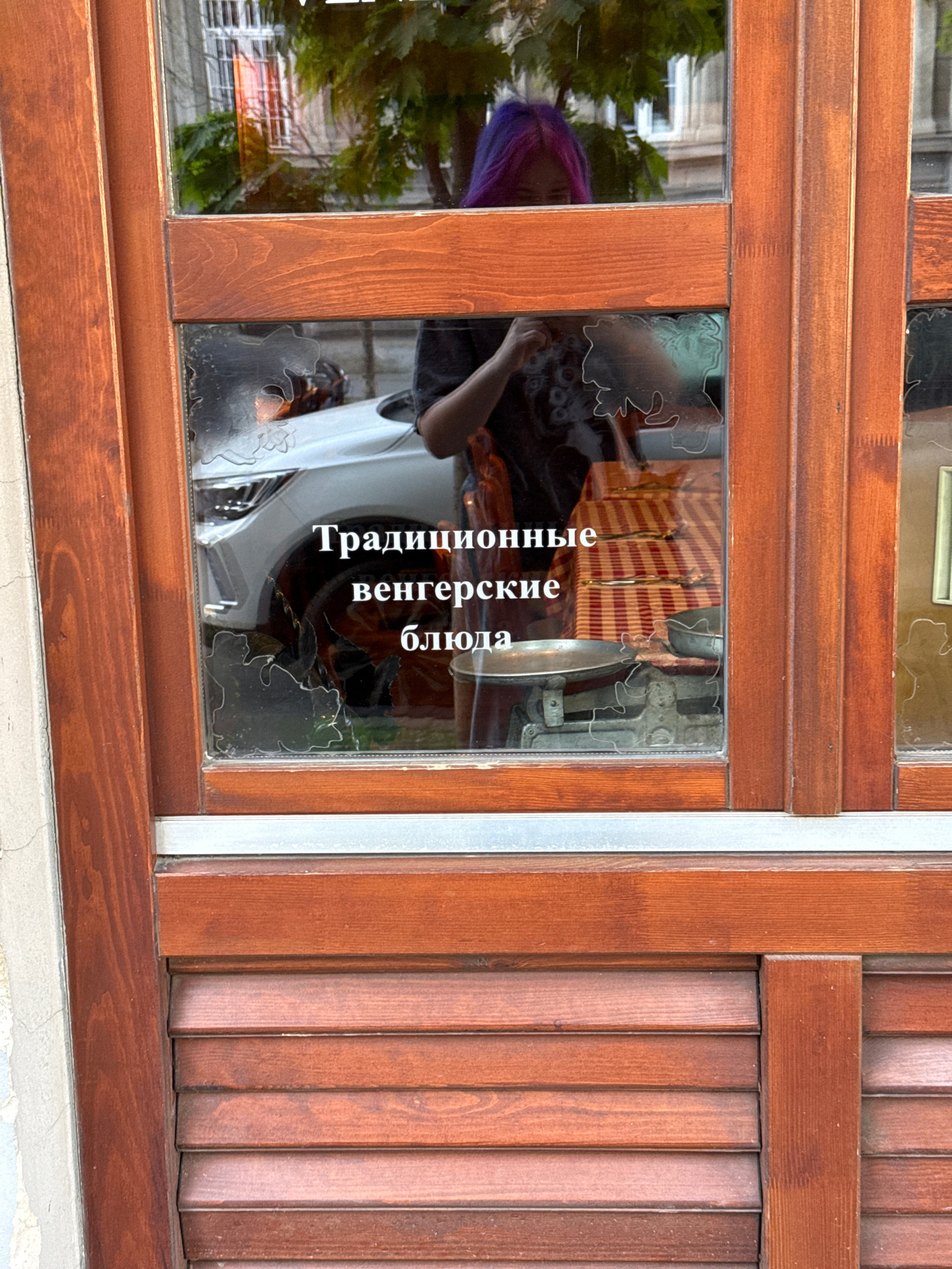 A window with a wooden frame is seen. The window has a reflective surface. It features a sticker that says "Традиционные венгерские блюда" (Traditional Hungarian dishes). There is a reflection of a p…read more
