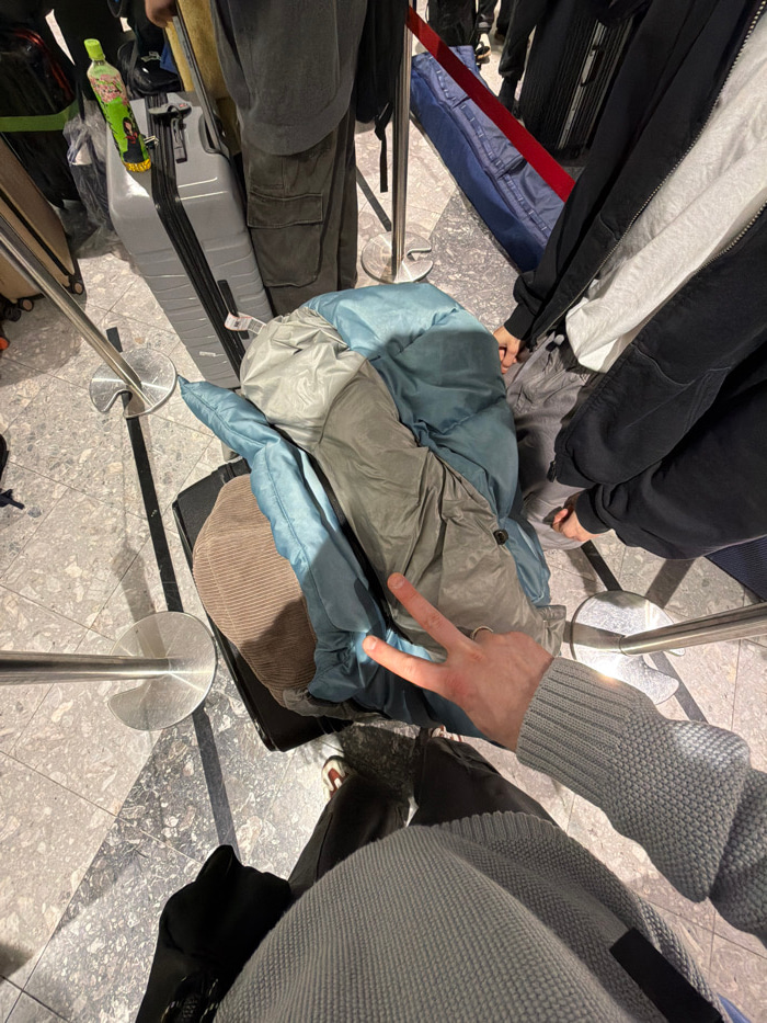 The scene depicts an interior queuing area within a public facility in Chitose, Japan, likely New Chitose Airport. The image is taken from a high-angle perspective, focusing on the ground level. In th…read more
