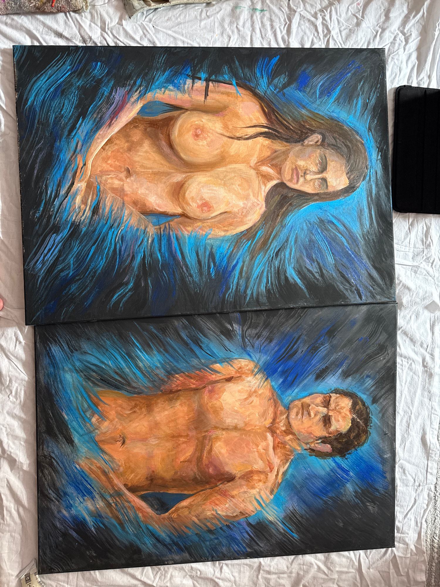 The image shows two oil paintings, side-by-side, depicting a nude woman and a nude man. The woman on the left has long, dark hair and is painted with light brown skin tones. The man on the right has s…read more