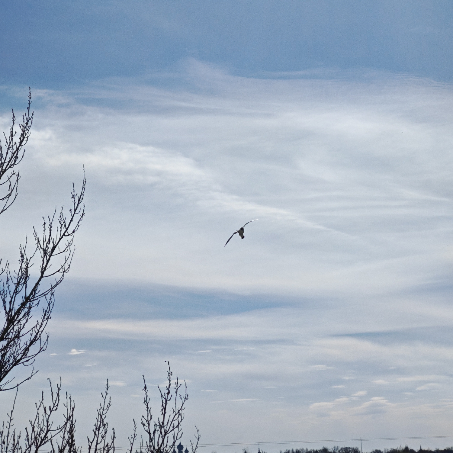 The image depicts a serene sky over Rostov, Russia, with a solitary bird in flight. The sky dominates the frame, showcasing a gentle gradient from light blue at the top to a softer, cloudier white towβ¦read more