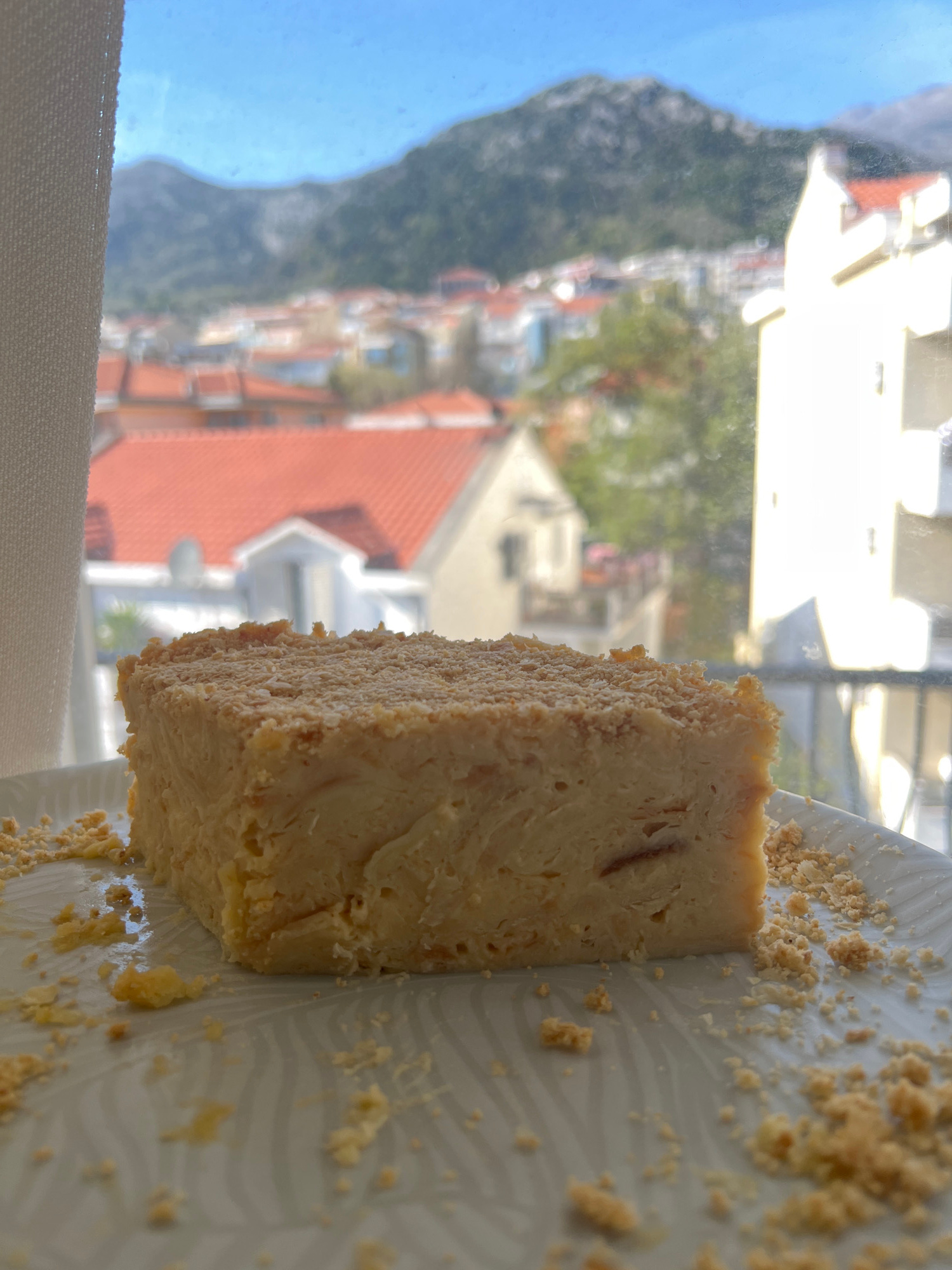 A slice of cake rests on a white plate with scattered crumbs, likely a graham cracker crust, in front of a window. The background reveals a partial cityscape with buildings featuring red-tiled roofs,β¦read more