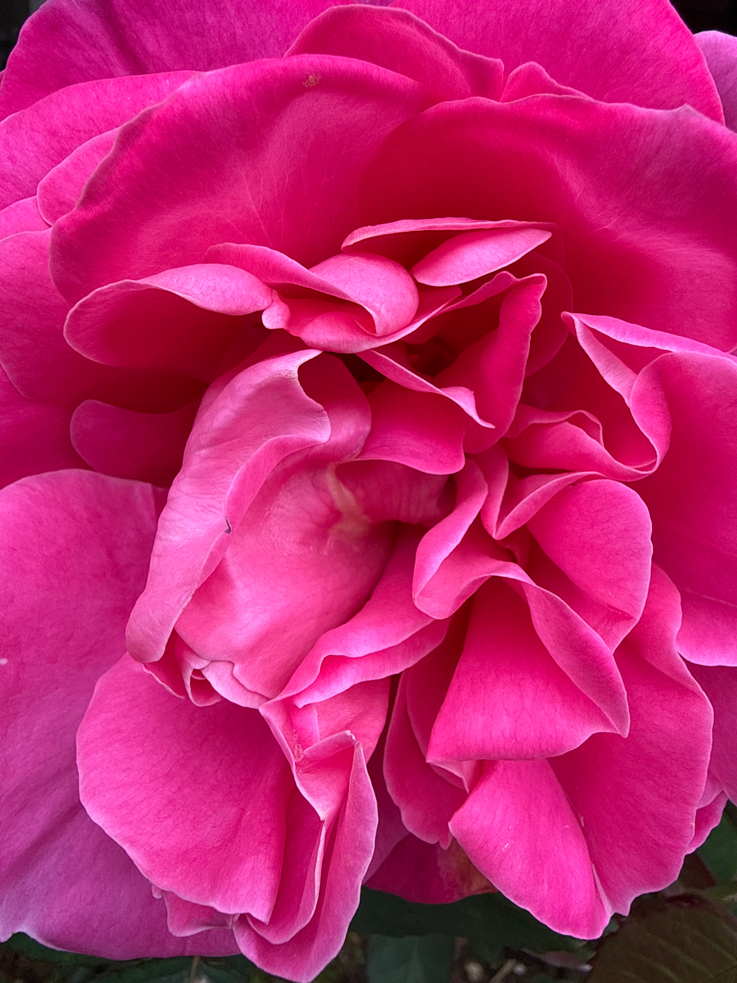 The image displays a detailed, macro view of a single, fully bloomed rose. The flower exhibits a vibrant fuchsia or deep pink coloration across all visible petals. Petals are densely layered, overlapp…read more