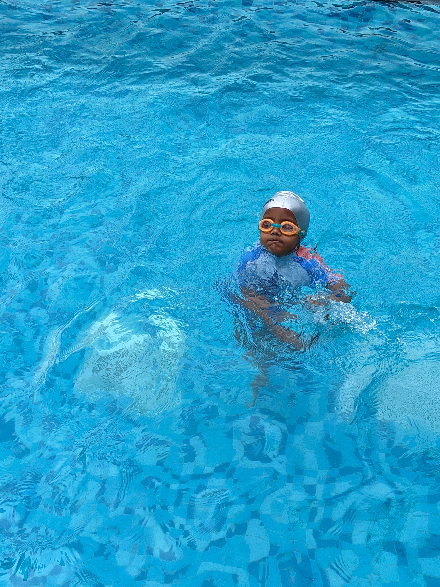 A child, wearing a silver swimming cap and orange-rimmed goggles, is partially submerged in a swimming pool filled with light blue water. The child is wearing a blue and orange long-sleeved rash guard…read more