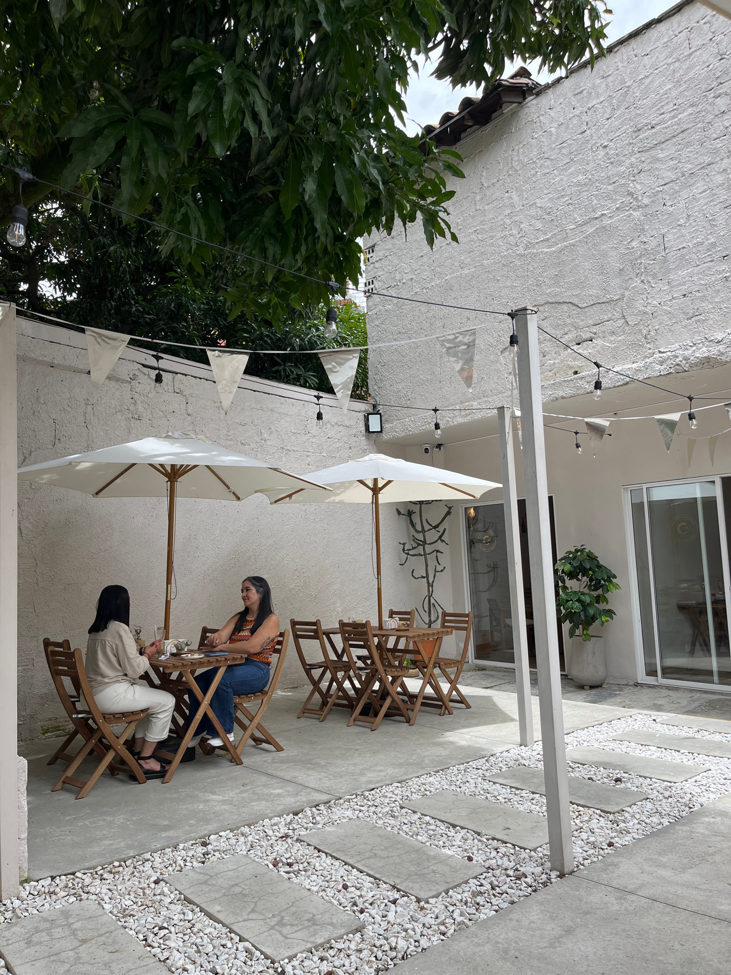Two women sit at a wooden table under a white umbrella in an outdoor patio setting. The patio has a concrete floor with rectangular sections separated by white gravel. Several wooden folding chairs ar…read more