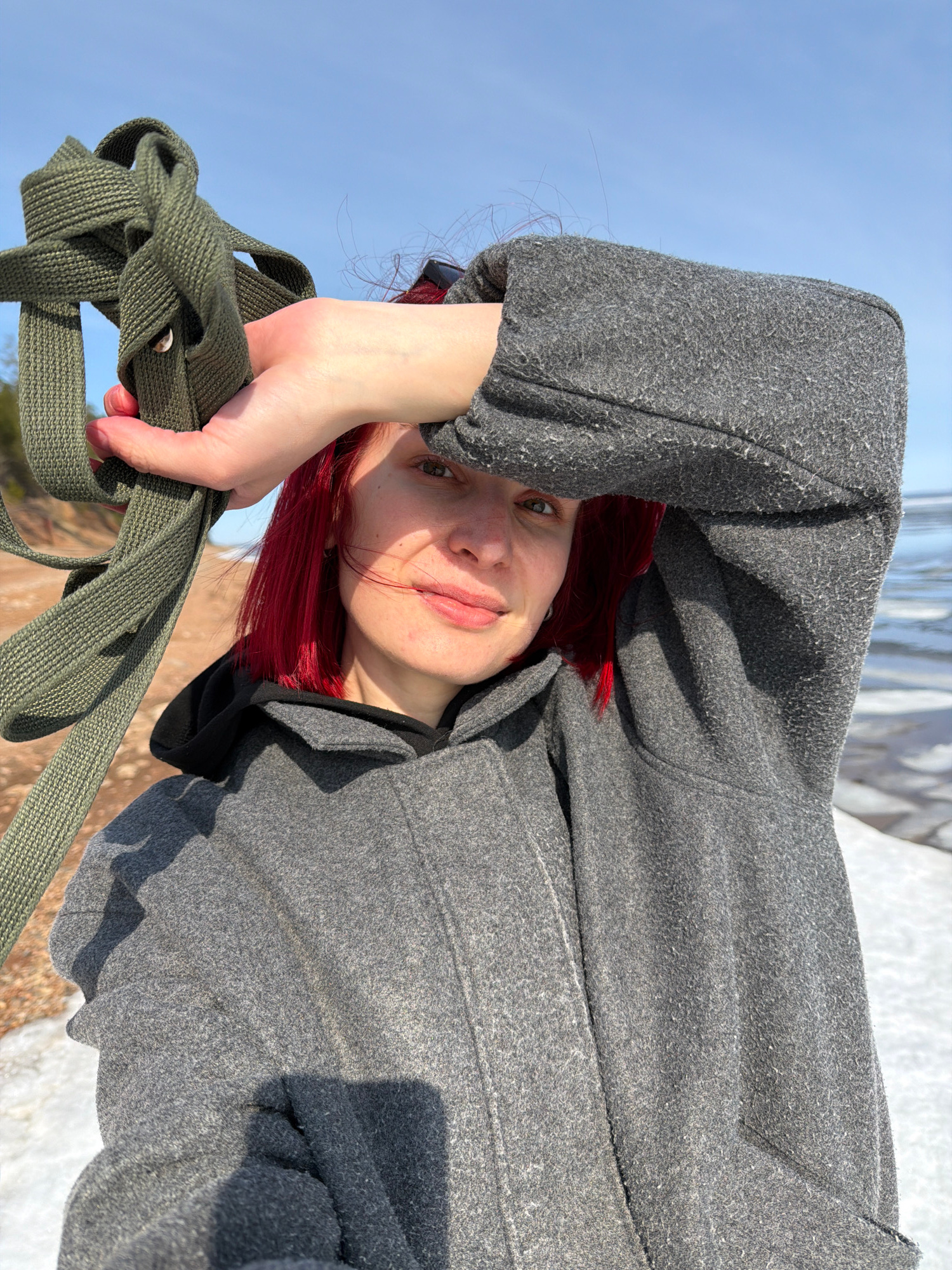 A person with red hair wearing a gray coat is holding a knotted olive green strap. The background shows a patch of snow, with a landscape of brown and white. The sky is blue. The location is Noviy, Ru…read more