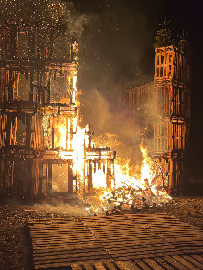 A towering structure composed of wooden pallets engulfed in flames against a dark night backdrop. The fire illuminates the stacked pallets, creating a vibrant orange and yellow glow amidst smoke. To the left, two evergreens appear to top off the construction. Sparks dance through the air, adding a dynamic effect to the intense inferno. Wooden planks are stacked adjacent to the main fire in the right corner. | Open Wire