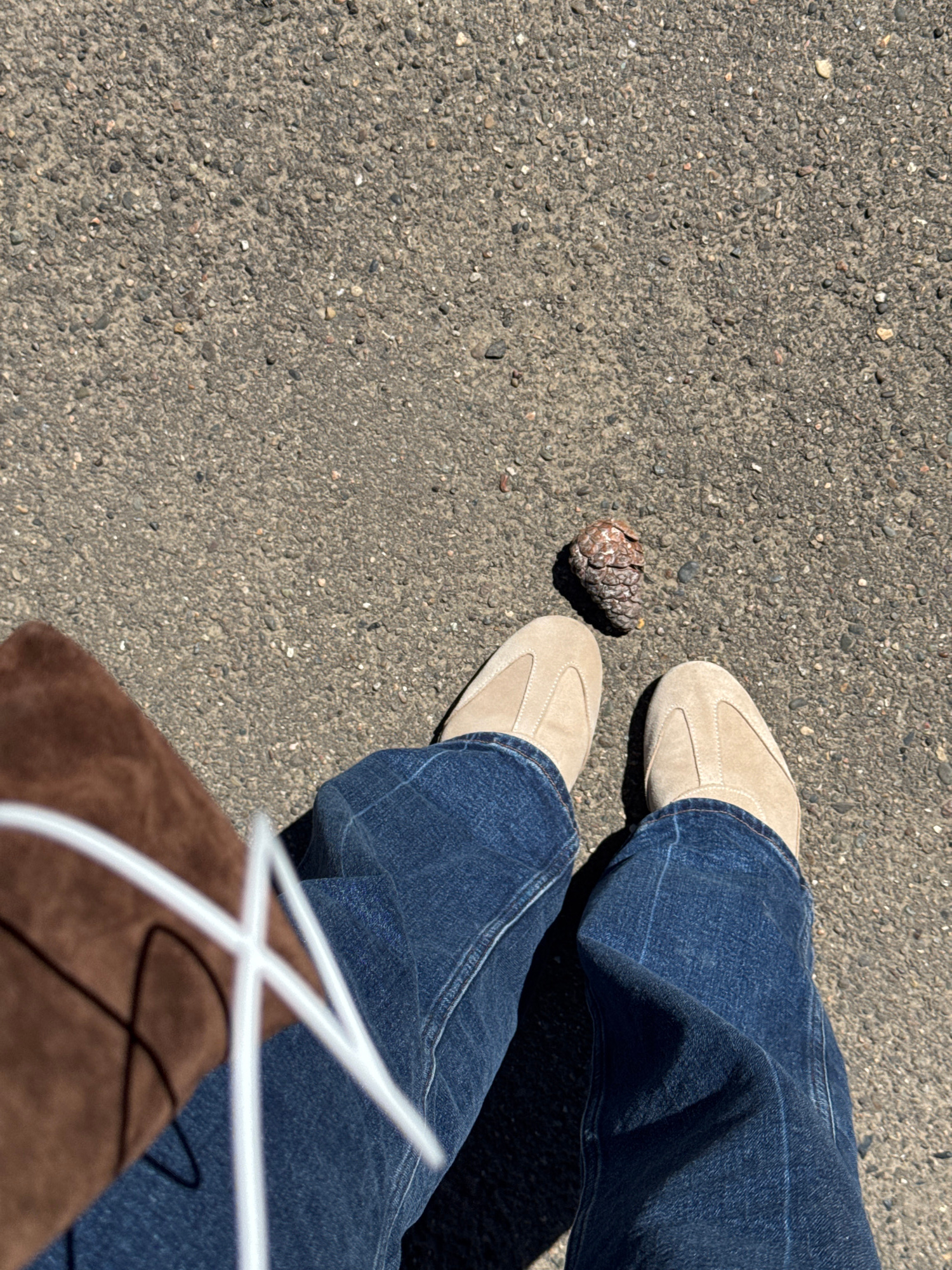 A high-angle shot on asphalt pavement shows a person's legs from the knees down, wearing blue jeans and tan-colored slip-on shoes. Between their feet is a single pine cone. A brown bag with white draw…read more