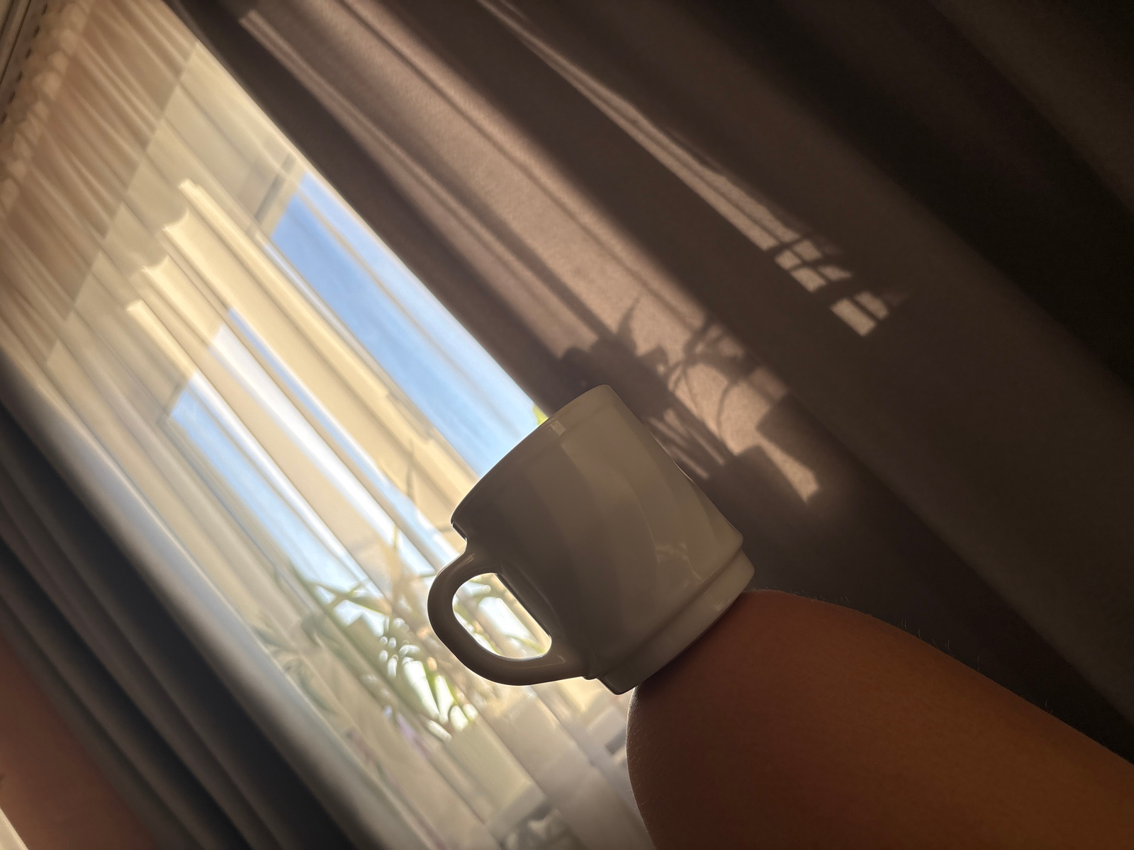 A white ceramic mug sits balanced on a person's knee. Behind the mug, light filters through two layers of curtains: sheer white curtains closest to the window and heavier brown curtains further back.…read more