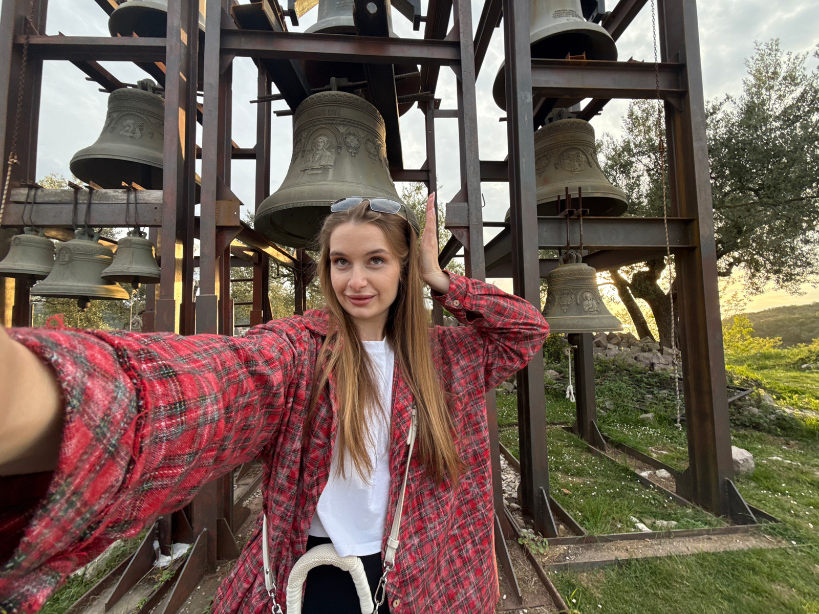 The image is taken in Đuraševići, Montenegro, showing a tower structure holding multiple bells of varying sizes. A young woman wearing a red plaid shirt over a white top is standing between the bells,…read more