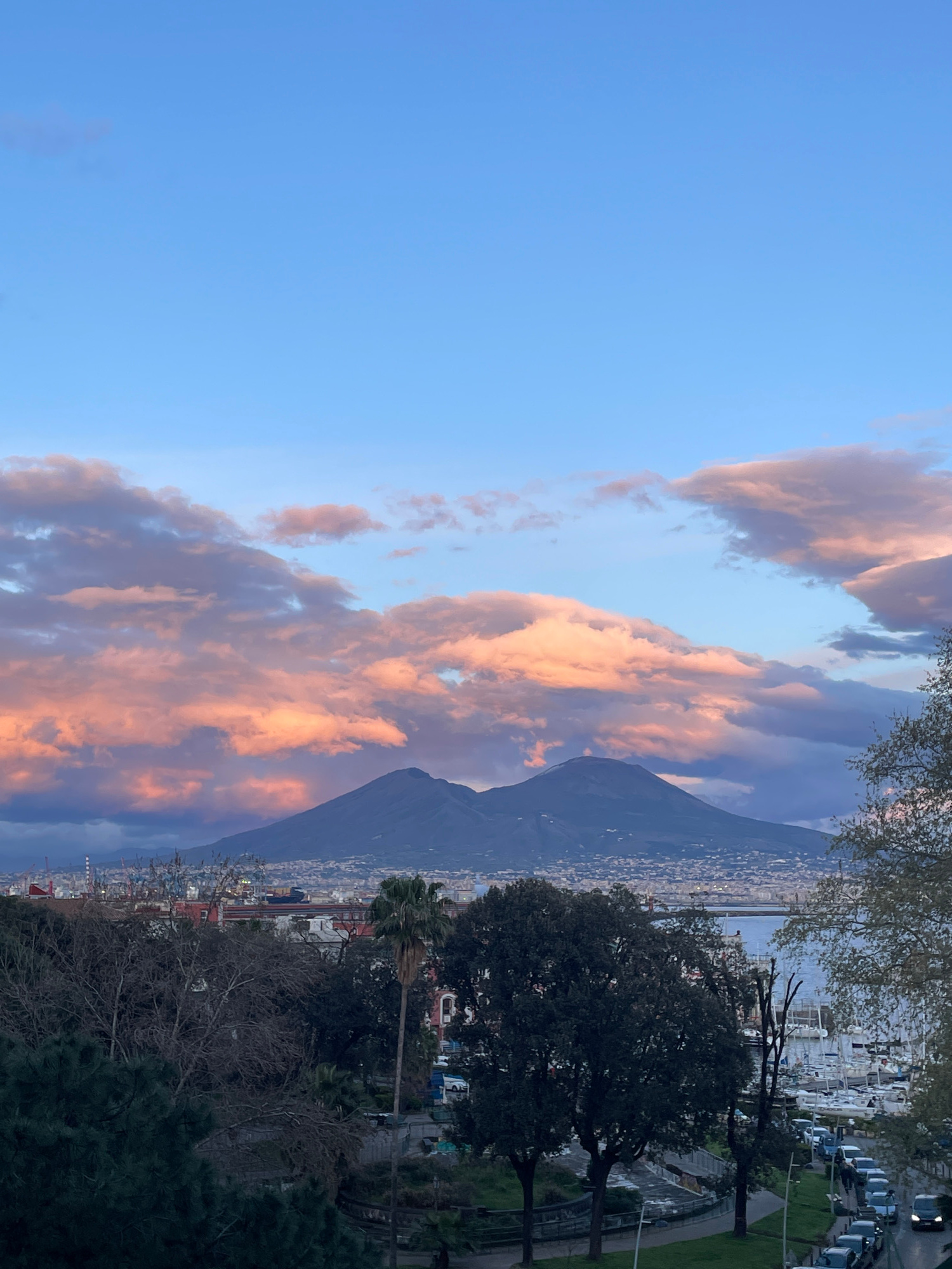 The image presents a panoramic, elevated view of Naples, Italy, at dusk or sunset. The upper half of the frame displays a sky with clear light blue regions transitioning to a deeper blue, punctuated b…read more