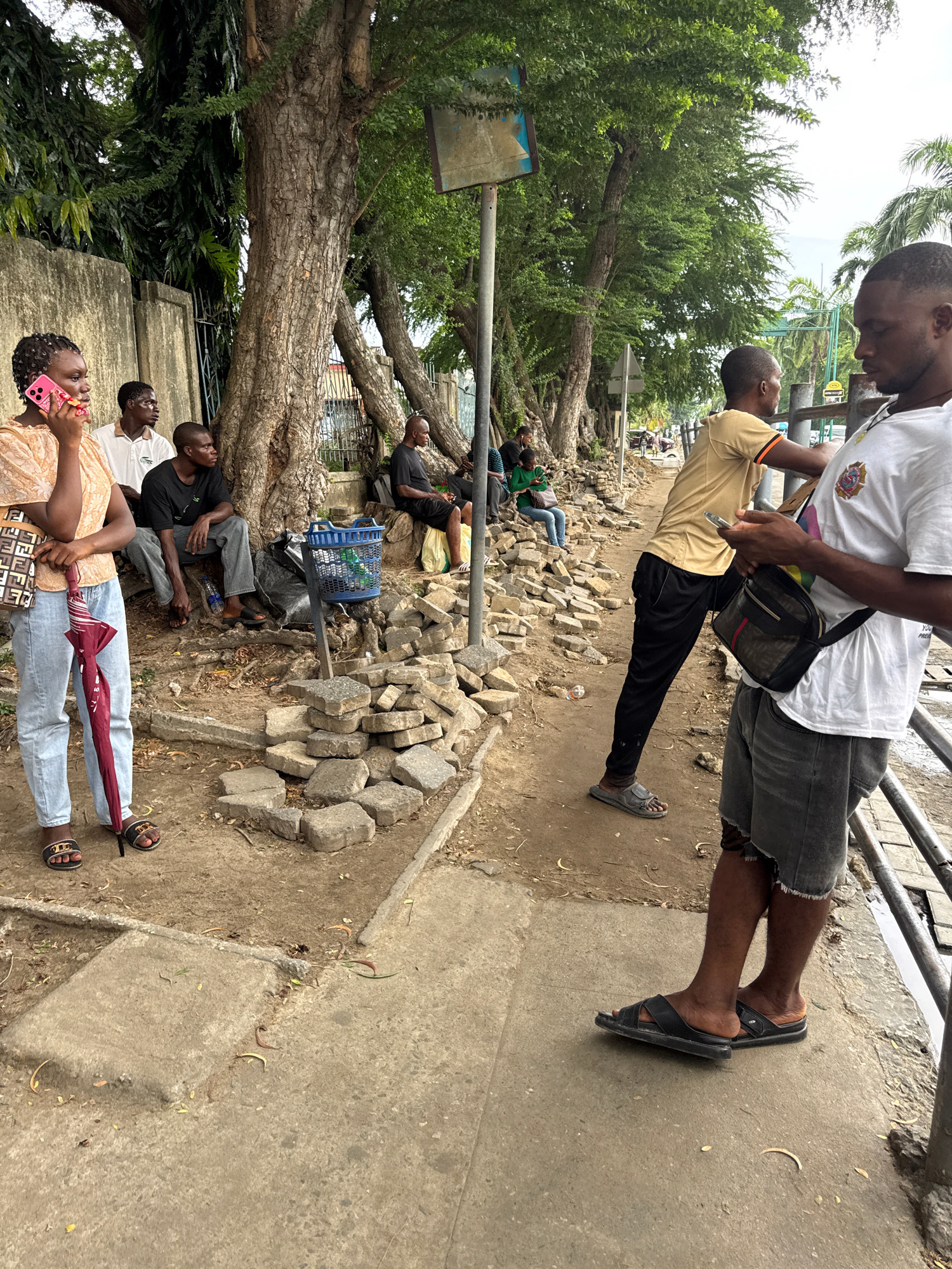 The image captures an outdoor scene, rotated ninety degrees clockwise, showing a group of people gathered along a pathway or roadside. The setting features a concrete path transitioning into dirt, fla…read more