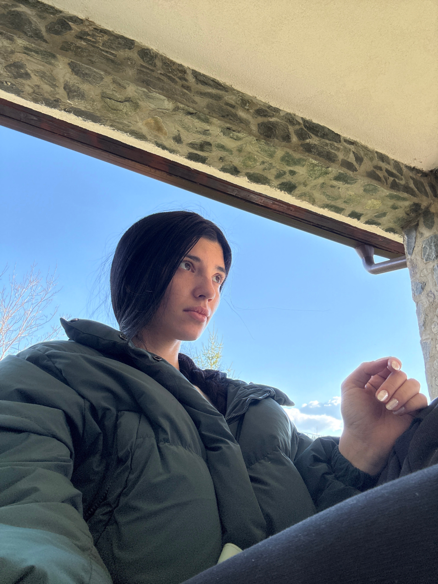 The image is a low-angle shot of a person looking upwards. The subject has dark hair and is wearing a dark green puffer jacket. The background consists of a bright blue sky, part of a building with st…read more
