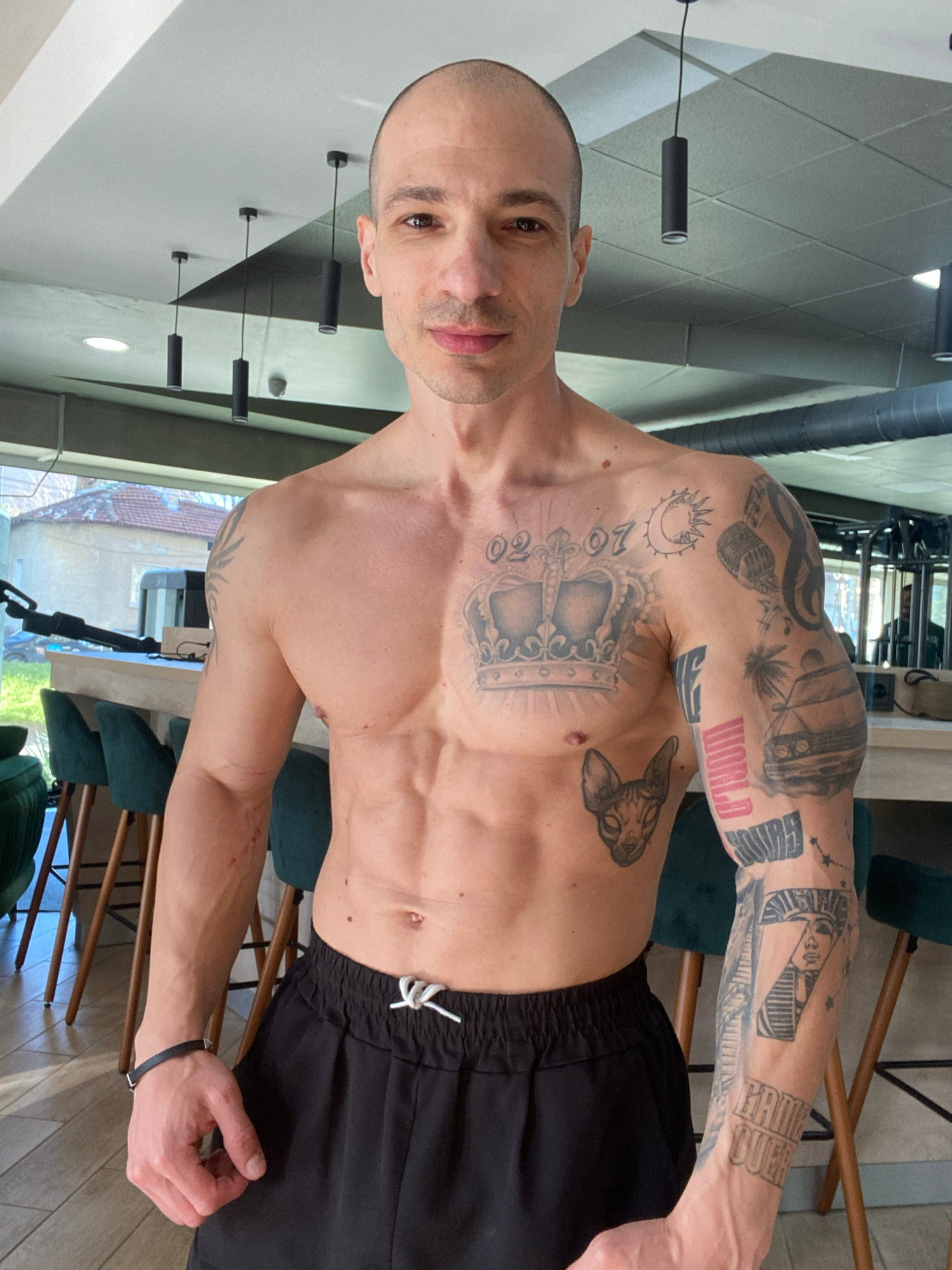 A shirtless, muscular man with a shaved head poses in a gym, wearing black shorts with a white drawstring. He has extensive tattoos covering his upper body, including a crown, "WORLD," and other desig…read more