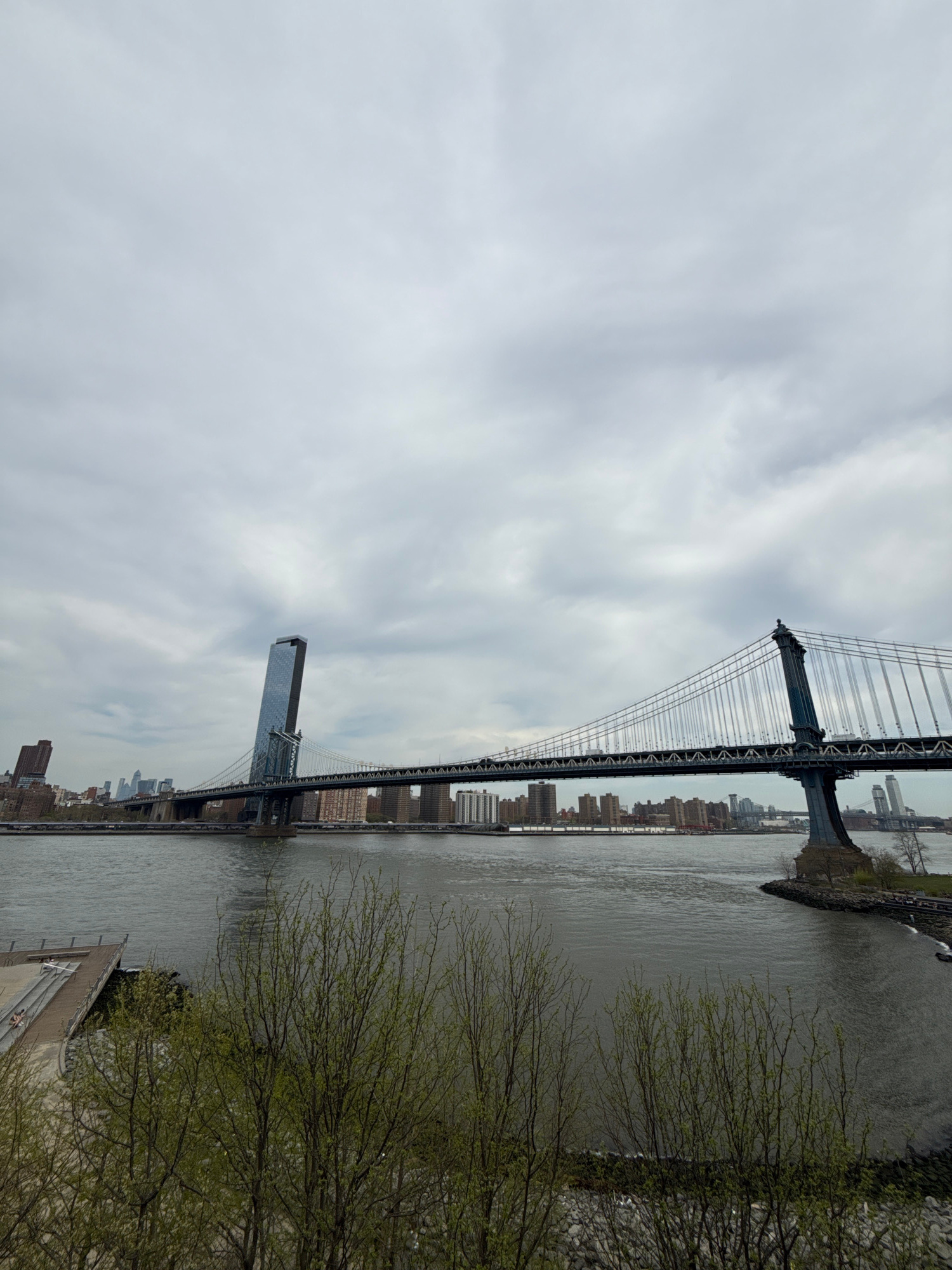 The image depicts the Manhattan Bridge, a suspension bridge that crosses the East River in New York City, connecting Lower Manhattan with Downtown Brooklyn. The bridge's steel cables and towers are pr…read more