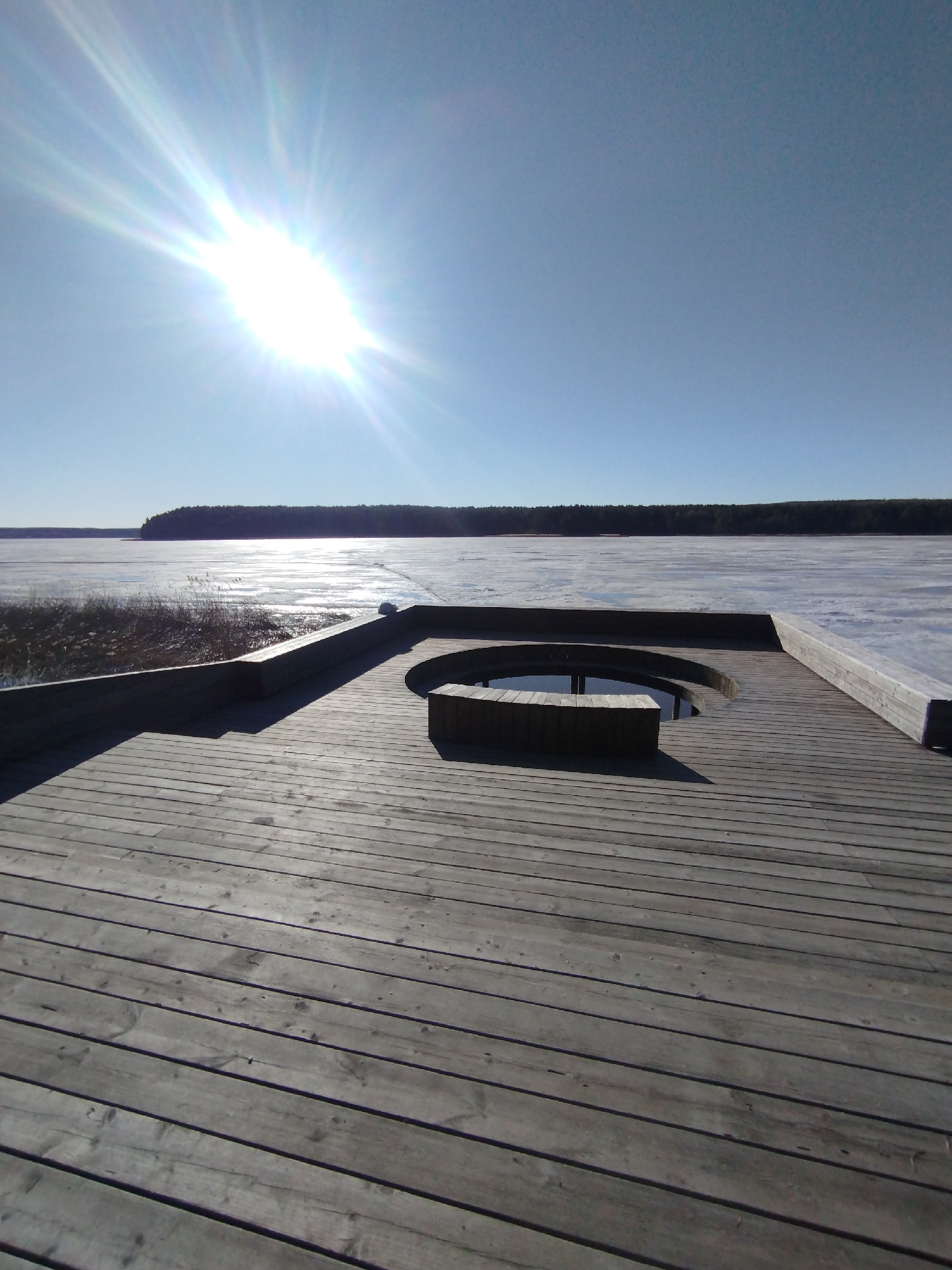 The image depicts a wooden deck on the shore of a partially frozen body of water, possibly a lake. In the center of the deck is a circular opening with water visible within. The deck is constructed of…read more