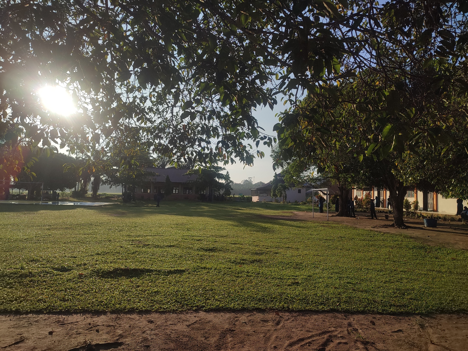 The image shows a grassy field in Blangriek, Indonesia. Buildings are visible in the background, partially obscured by trees. The sun shines brightly through the leaves of trees in the upper left corn…read more