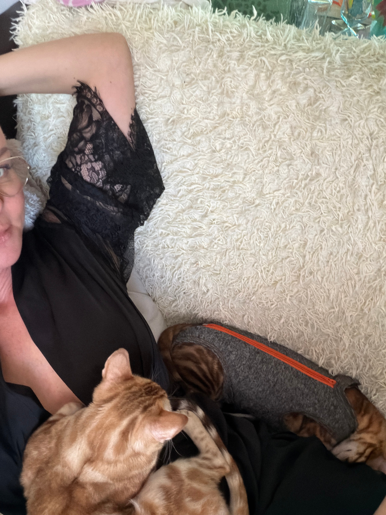 An overhead shot reveals a reclining person on a white, shag-like rug, wearing a black dress with a lace hem. Resting on the person are two Bengal cats with distinctive spotted coats. One cat has its…read more