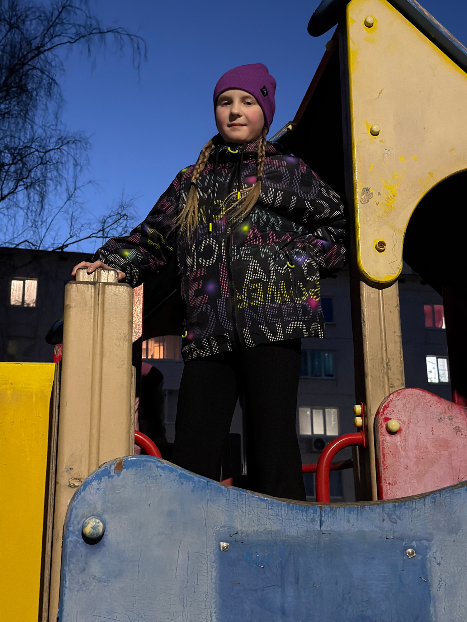 A young girl with blonde braided hair and a purple beanie is playing on playground equipment. She is wearing a black jacket with colorful patterns and black pants. She is holding onto a white ledge of…read more