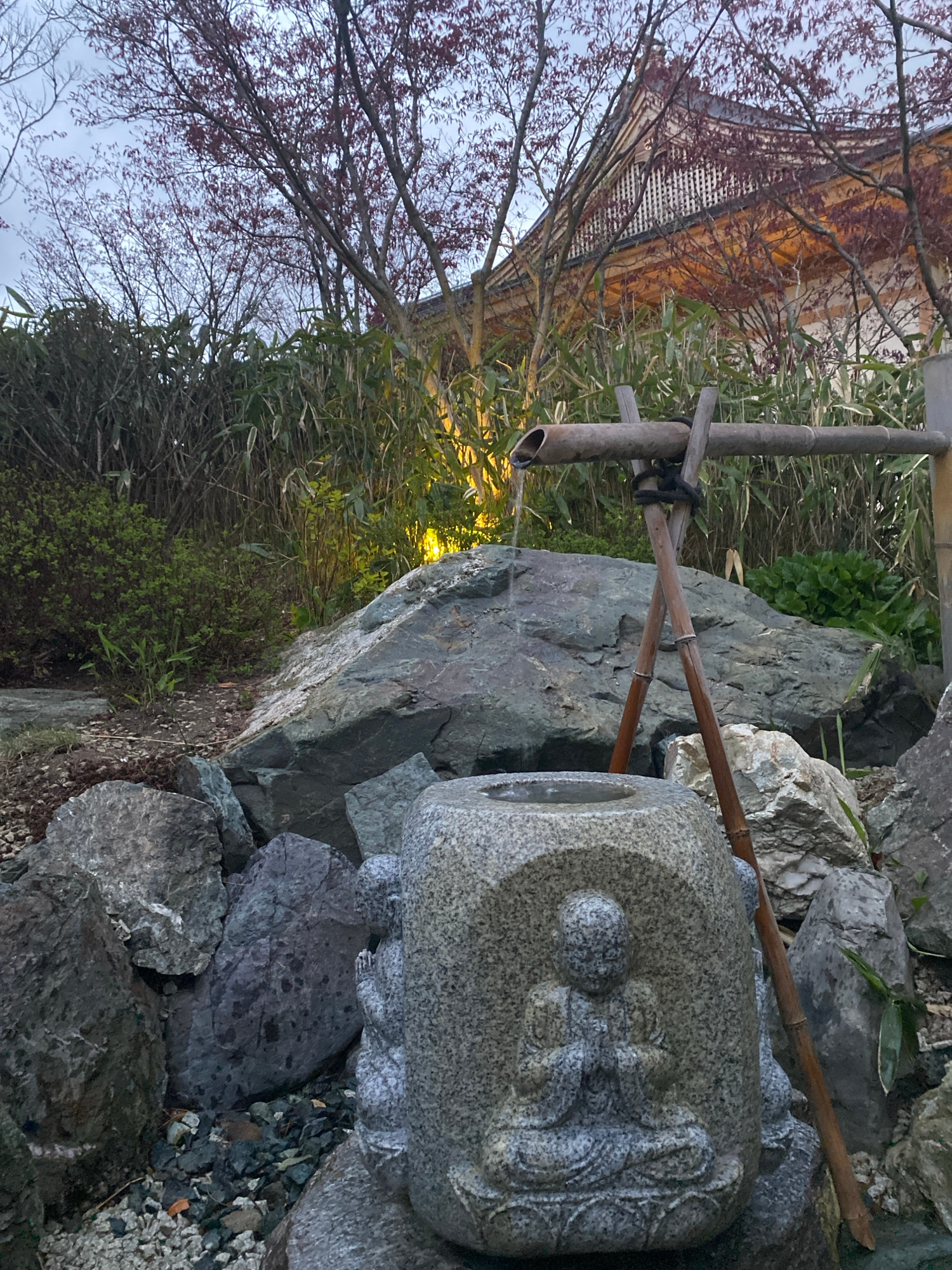 The image shows a Japanese-style garden feature with a stone water basin and bamboo water spout. The basin is decorated with a carved figure. The setting includes rocks, gravel, and various plants, in…read more