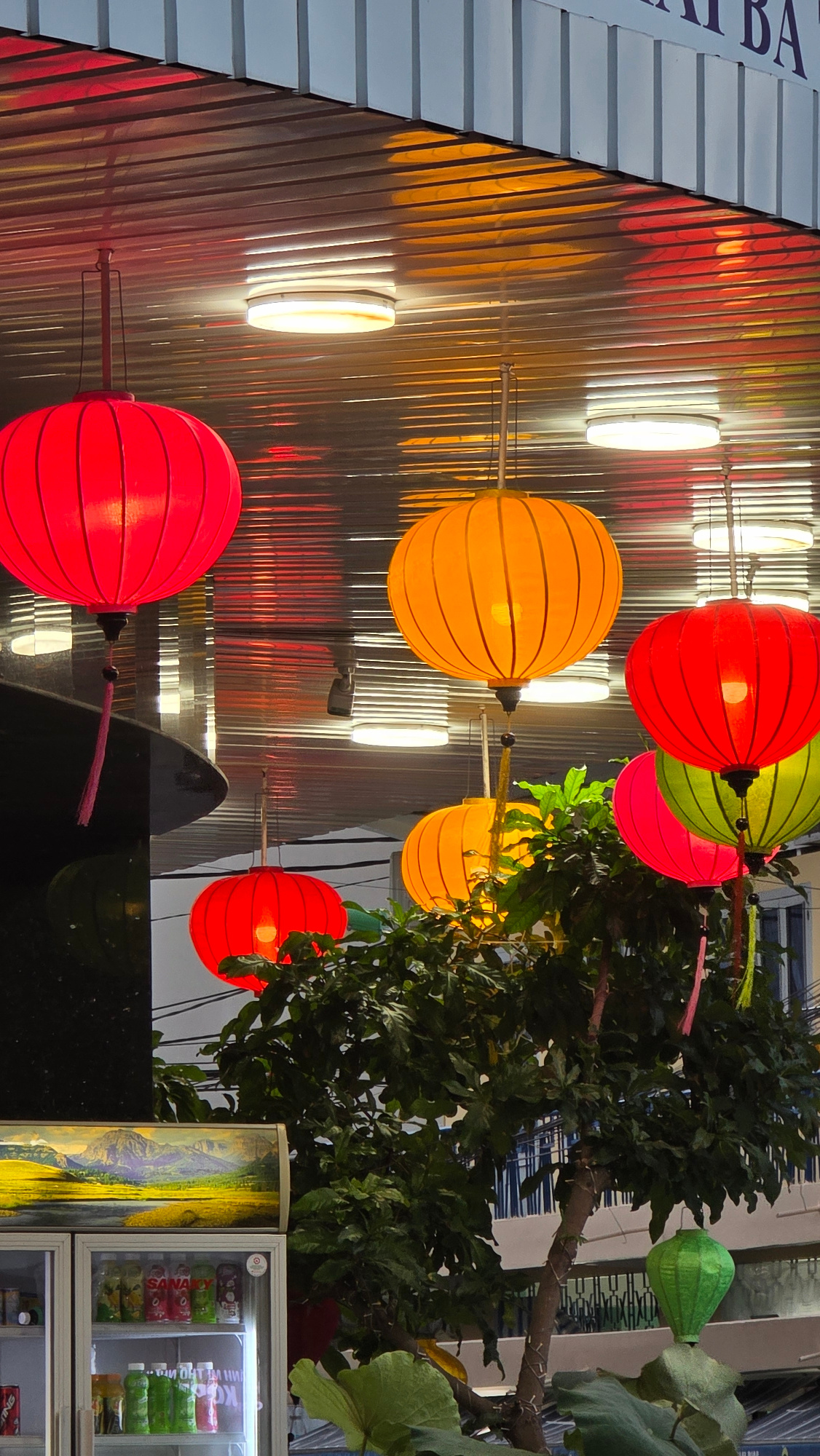 The image shows a street scene in Nha Trang, Vietnam, at night. Lanterns in red, orange, green, and pink hang from trees and wires overhead. A building with vertical, illuminated stripes is visible on…read more