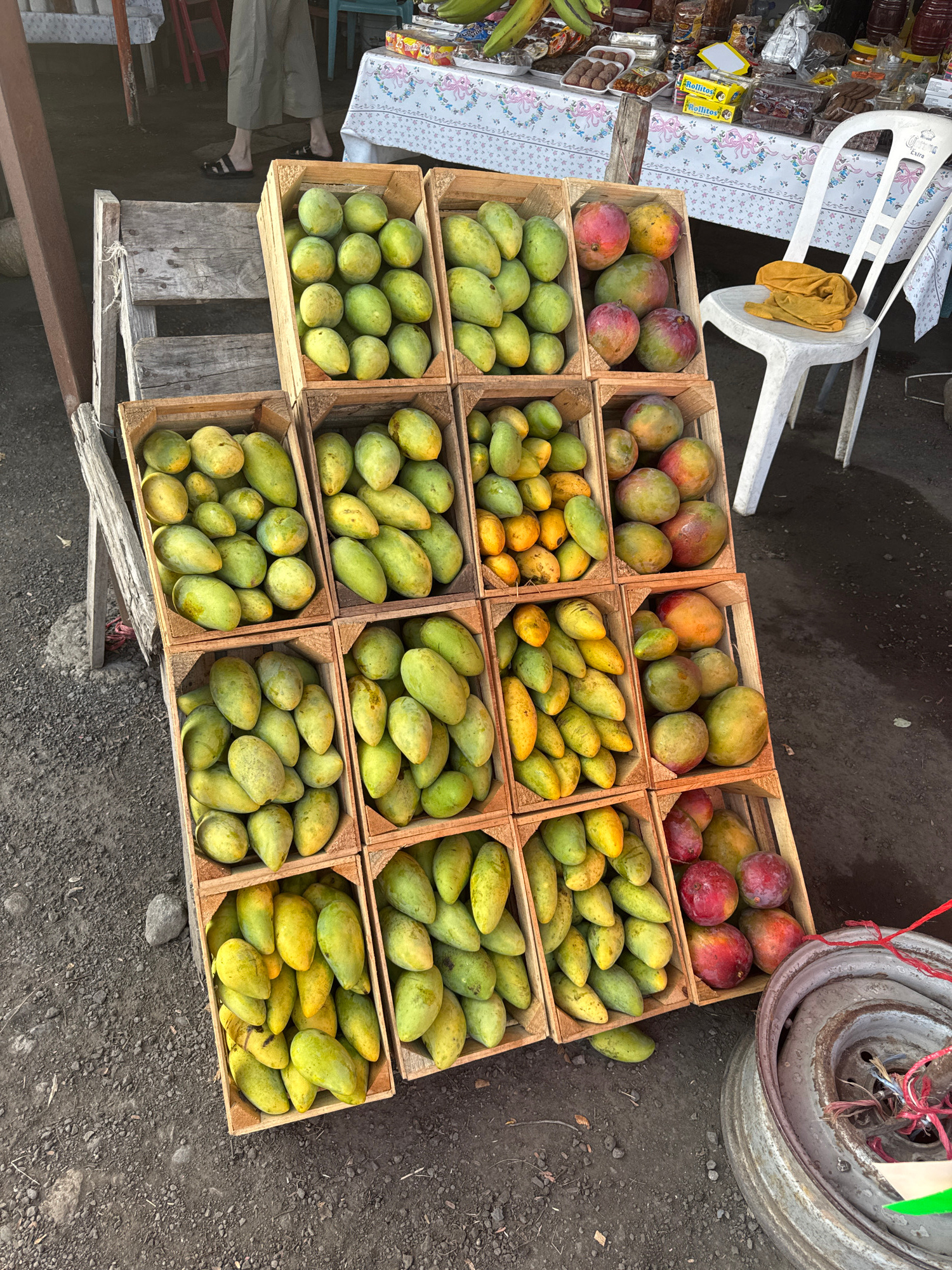The image captures a fruit stand located in Puente Nacional, Mexico. Multiple wooden crates are arranged on the ground, filled with mangoes in varying stages of ripeness, some green and others showing…read more