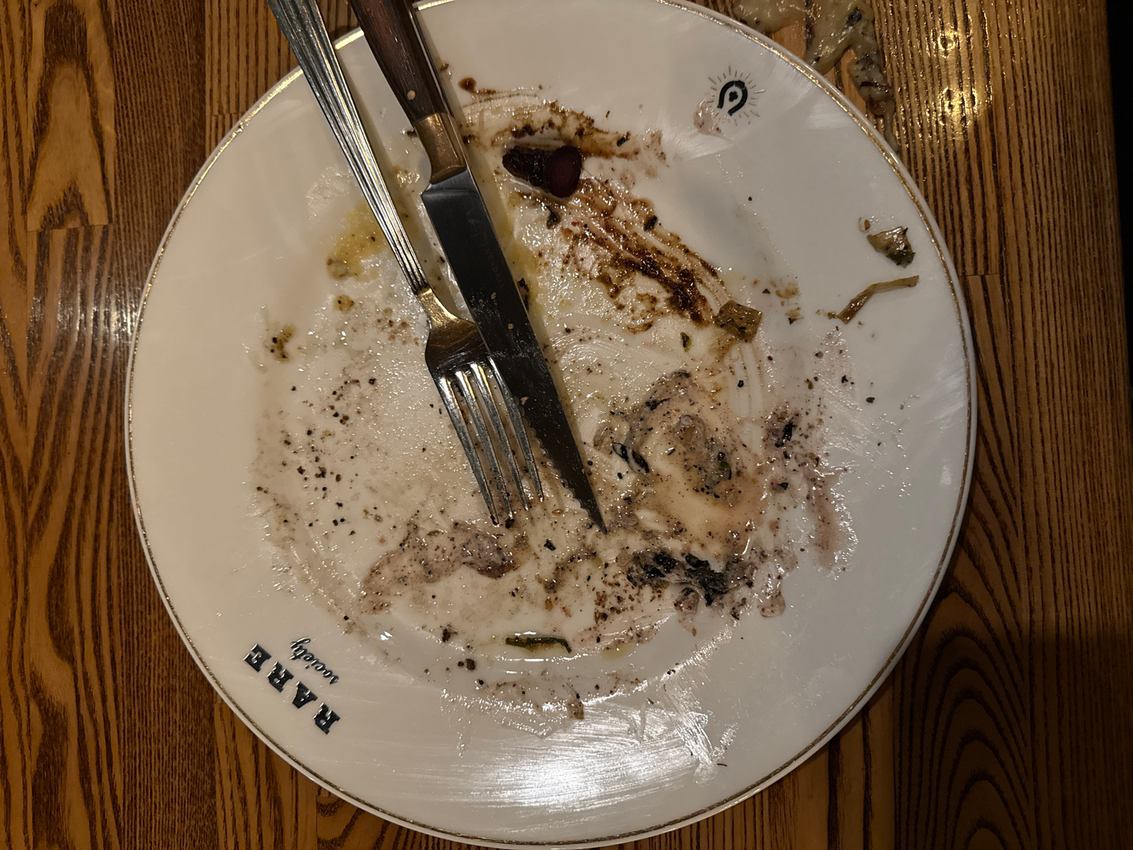 The image depicts a partially eaten meal on a white ceramic plate with the words "RARE society" and a logo resembling a sunburst on the top. A fork and knife lie on the plate, amidst food remnants con…read more