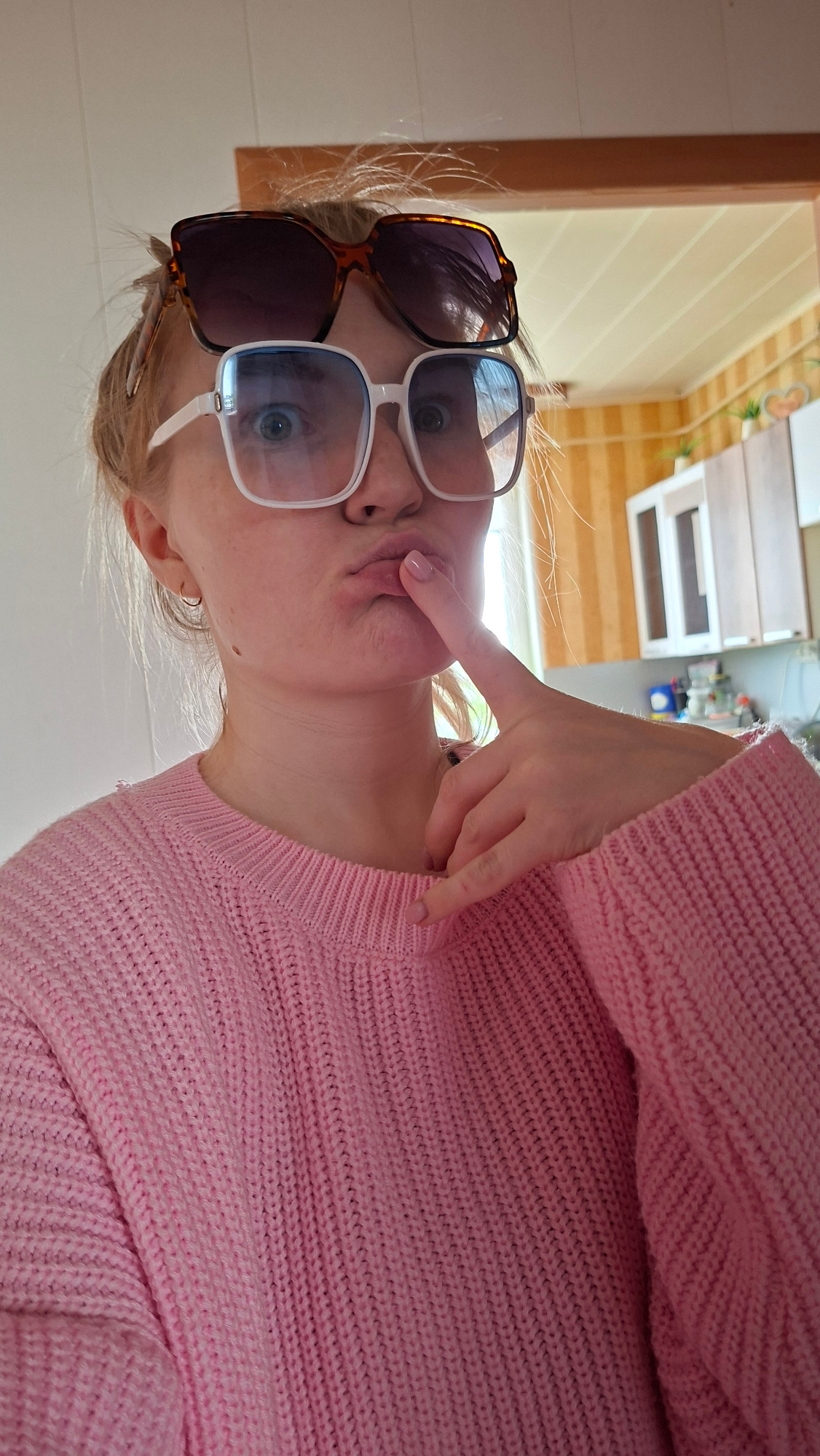 The image depicts a woman wearing two pairs of sunglasses, one tortoiseshell-framed pair stacked atop a white-framed pair. She is wearing a pink knitted sweater. Her right hand is raised, with a finge…read more
