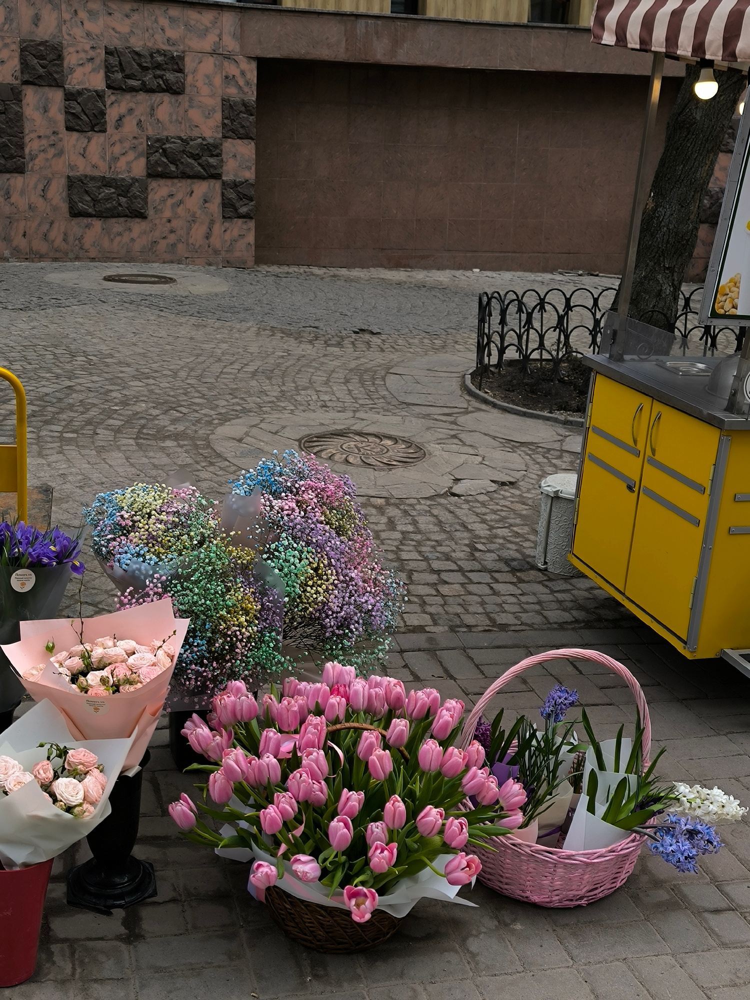The scene shows a flower stall on a cobblestone street, likely in Vinnytsia, Ukraine, judging by architectural style and typical street furnishings. The main focus is a vibrant array of flowers: bouqu…read more