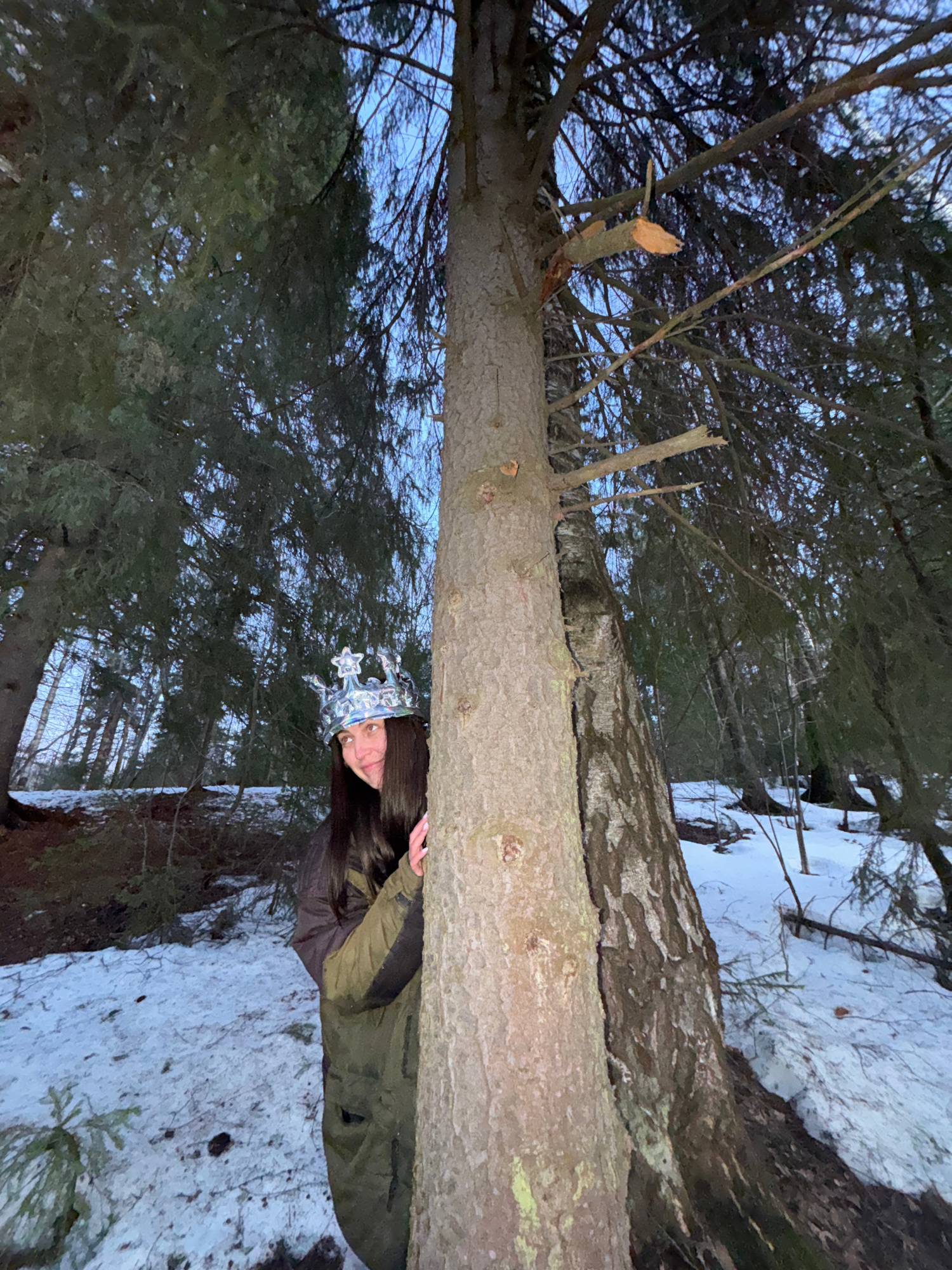 A woman wearing a crown stands behind a fallen tree in a snowy, forested area, likely in a park or wooded area. The background includes trees, snow-covered ground, and a twilight sky. The woman wears…read more