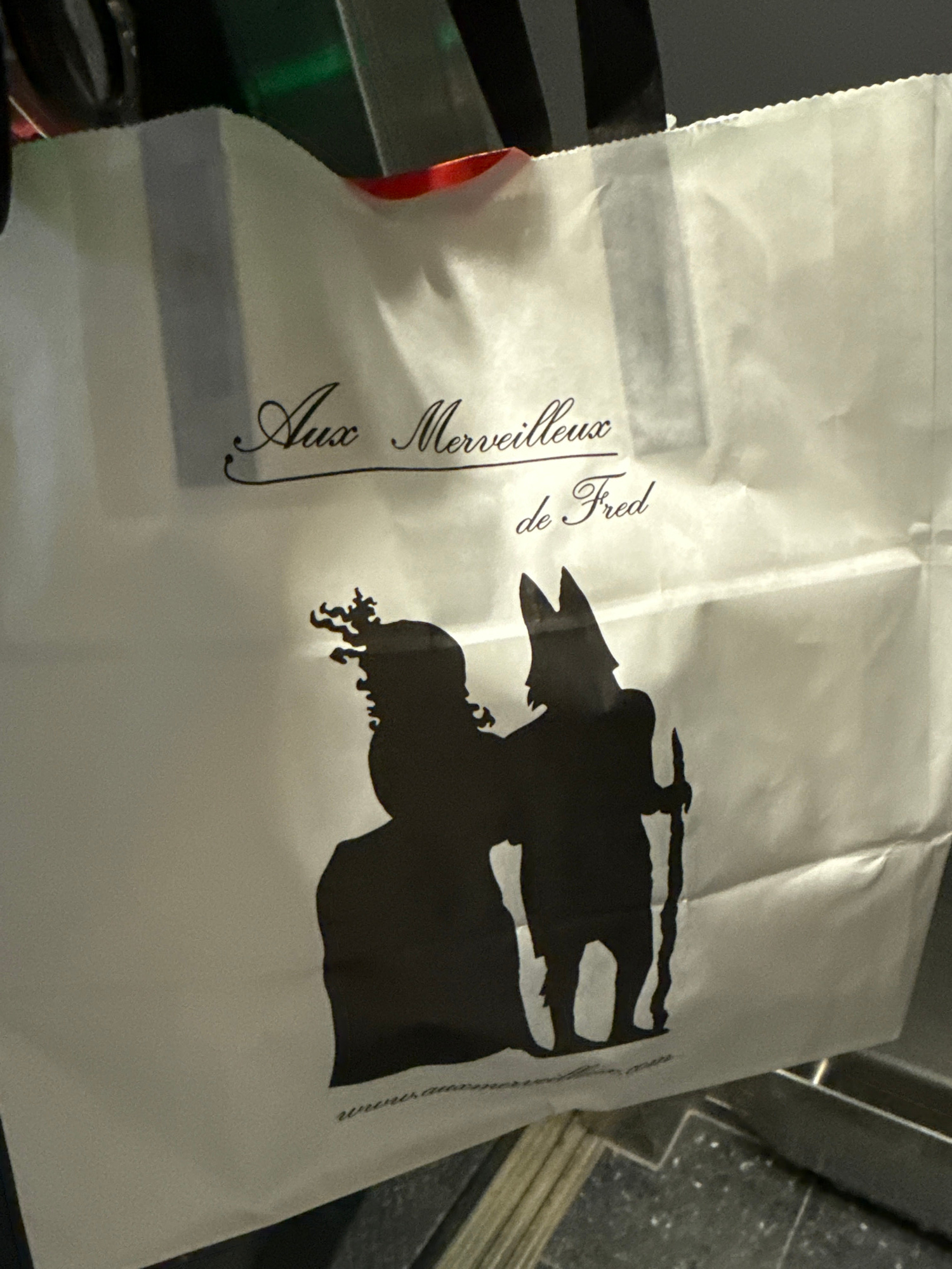 A white paper bag with the black silhouette of a person wearing a hat and the words "Aux Merveilleux de Fred" is sitting on a black surface. The bag appears to be from a bakery chain. The bakery chain…read more