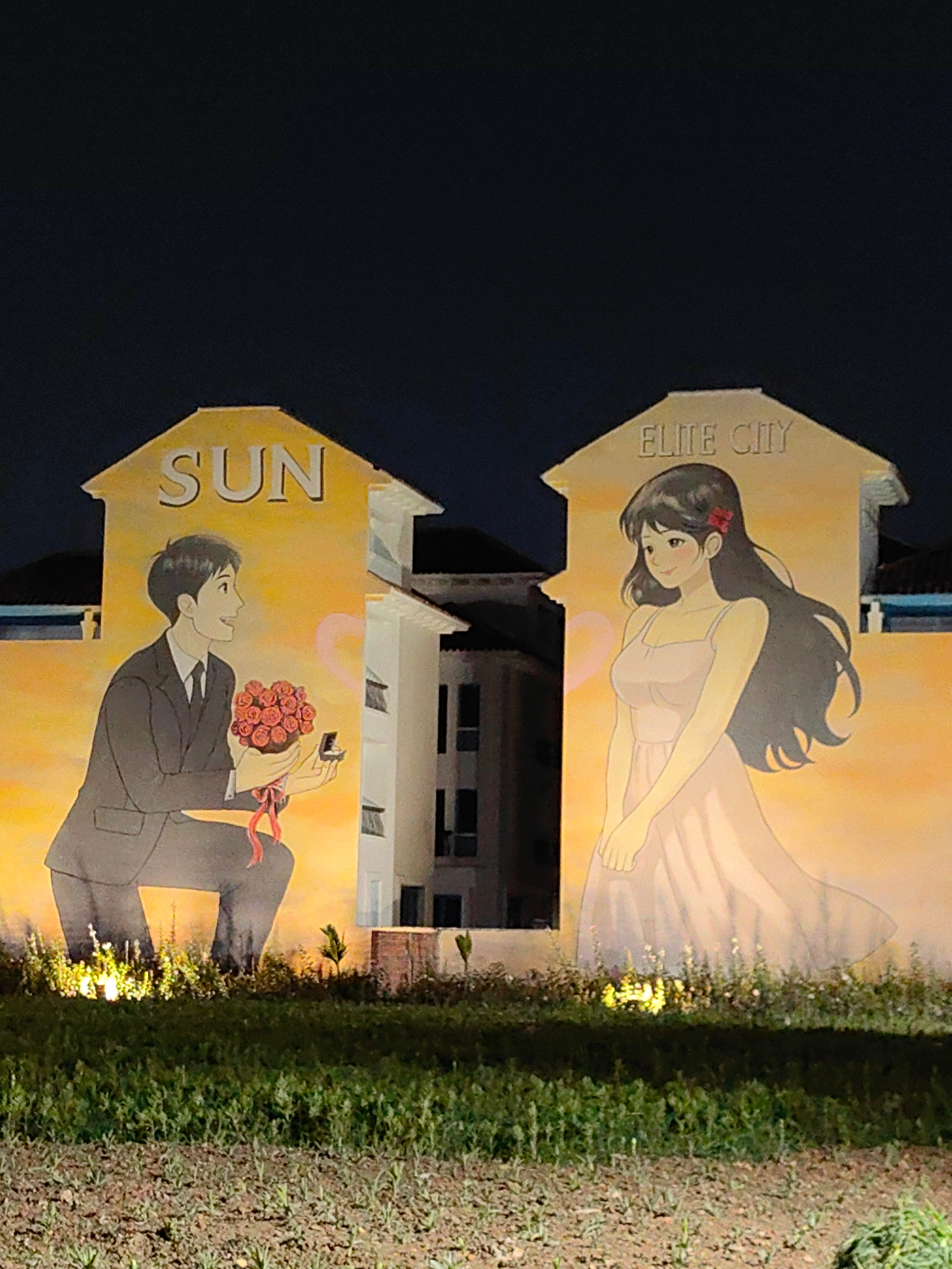 The image captures a scene at night in Bai Chay Ward, Vietnam. Two separate buildings are visible, each adorned with murals depicting a romantic narrative. The building on the left has the word "SUN"…read more