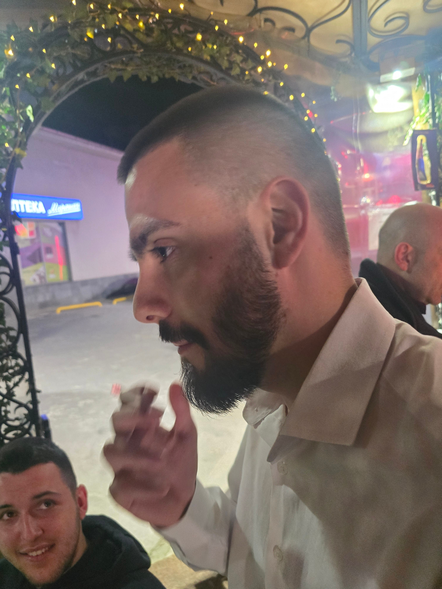 A low-angle, medium shot depicts a group of three men outdoors. The primary focus is on a man with a shaved head, a thick beard, and wearing a white collared shirt. He is holding a lit cigarette betwe…read more