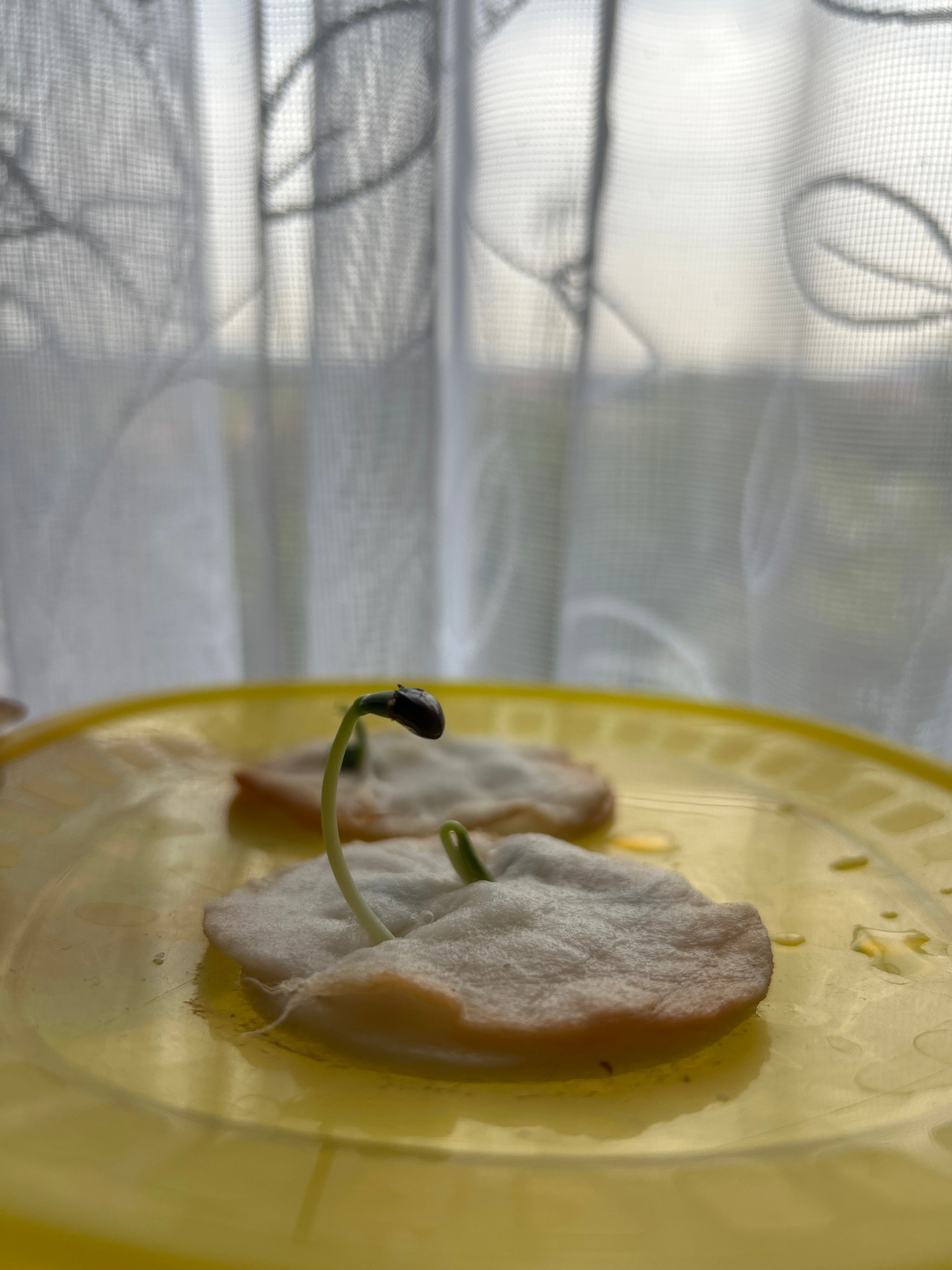 Two germinated seeds are sprouting on cotton pads inside a yellow plastic container. The container is positioned near a window covered with a sheer curtain that has a leaf pattern. The scene is brightβ¦read more