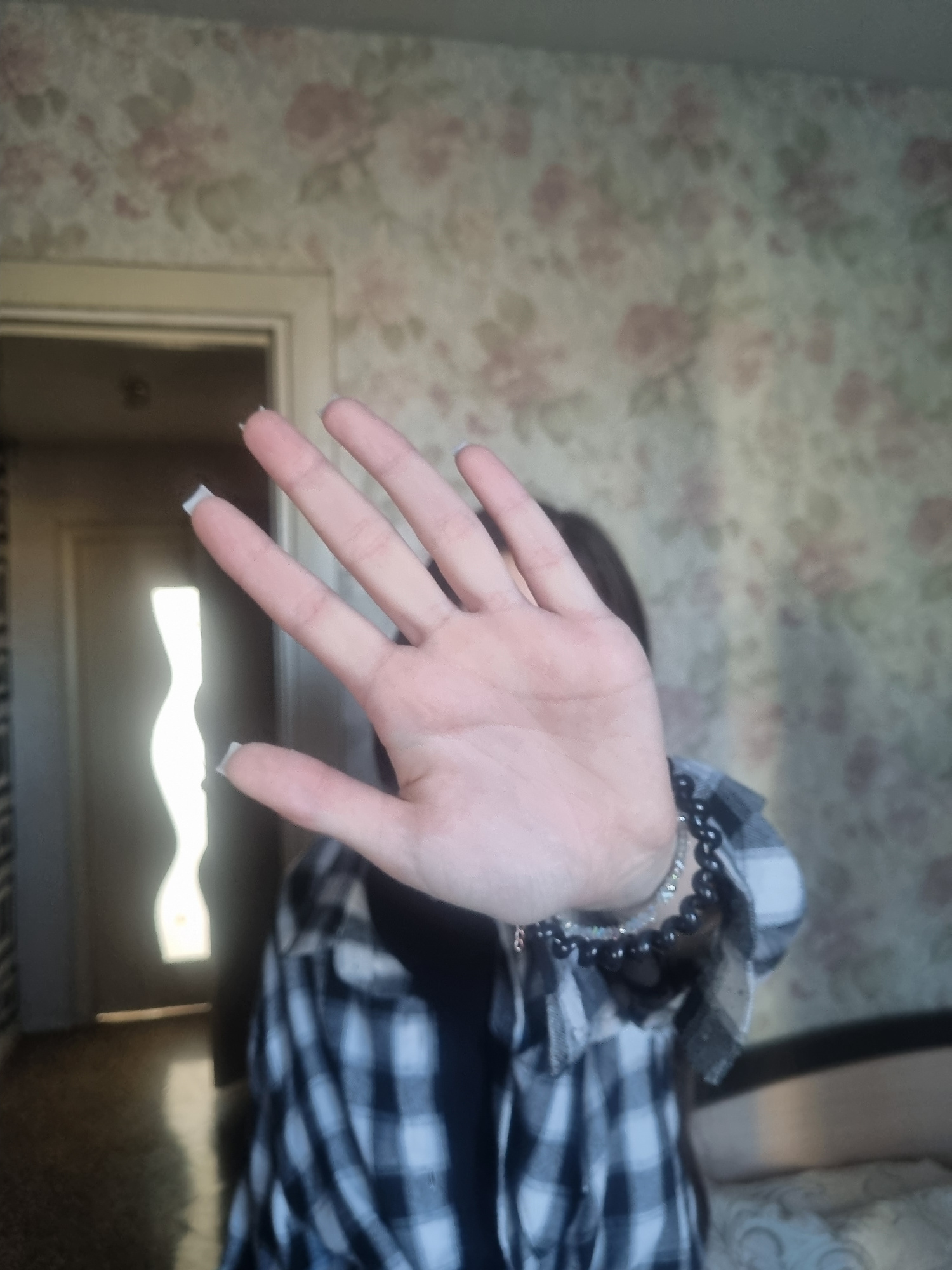 A hand extends towards the camera in front of a blurred background. The hand is fair-skinned with short, squared nails painted with a light grey or silver color. A beaded bracelet adorns the wrist, pa…read more