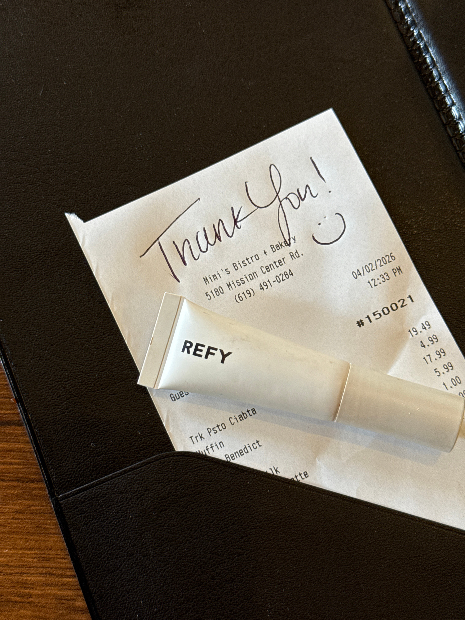 A receipt from Mimi's Bistro + Bakery, located at 5180 Mission Center Rd, San Diego, CA 92108, lies on a black leather-like surface. The receipt date is April 2, 2026, and the time is 12:33 PM. The it…read more