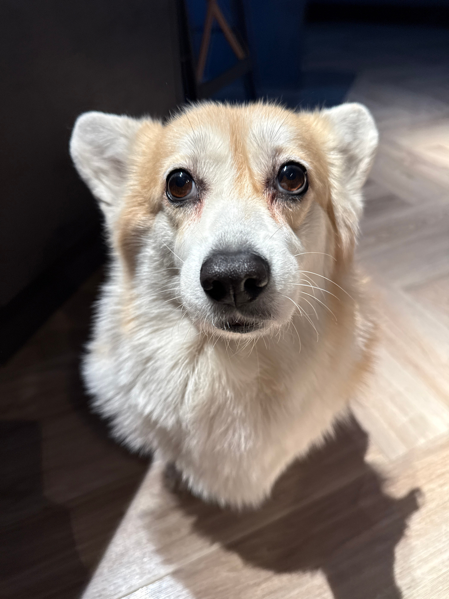 A tan and white corgi dog looks directly at the camera with its head tilted to the left. The dog has dark brown eyes and a black nose. The background is a light-colored wooden floor. A shadow is cast…read more