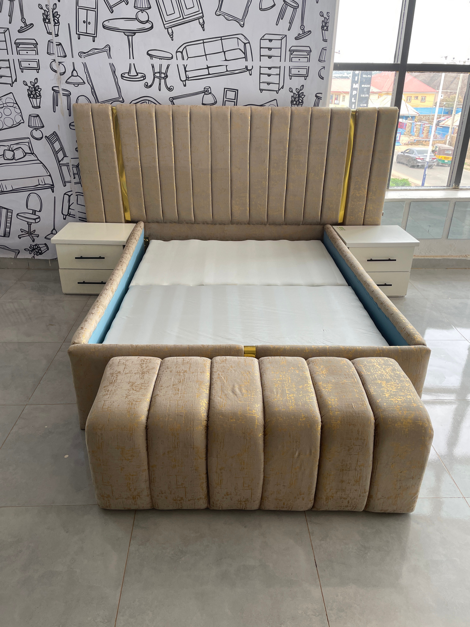 This image captures a modern bedroom or furniture showroom setting, showcasing a stylish bed and its immediate surroundings. The scene is static, devoid of people. The central subject is a large bed…read more