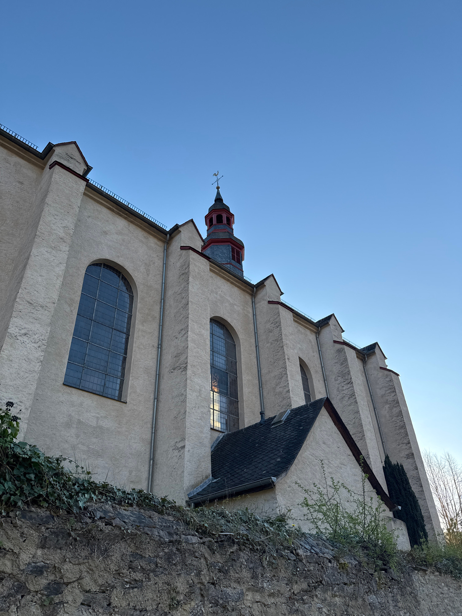 The image depicts a low-angle view of the Church of St. Joseph in Beilstein, Germany. The church's facade is visible, including its stepped exterior design with large arched windows and a spire topped…read more