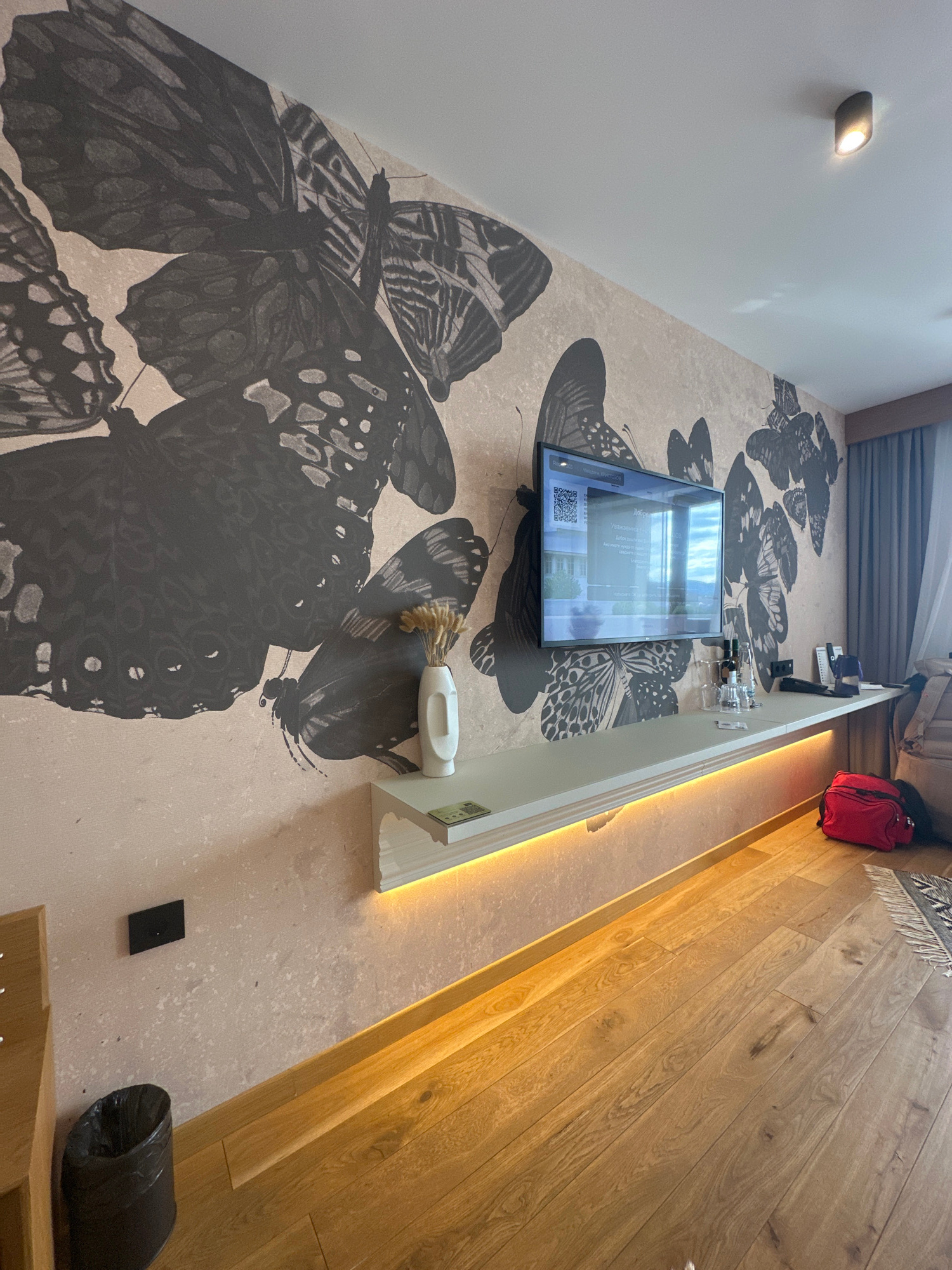 A high-angle shot reveals an interior space. The wall is adorned with a butterfly pattern. Mounted on the wall is a flat screen monitor and a wall-mounted shelf. A black garbage bag rests in the corne…read more