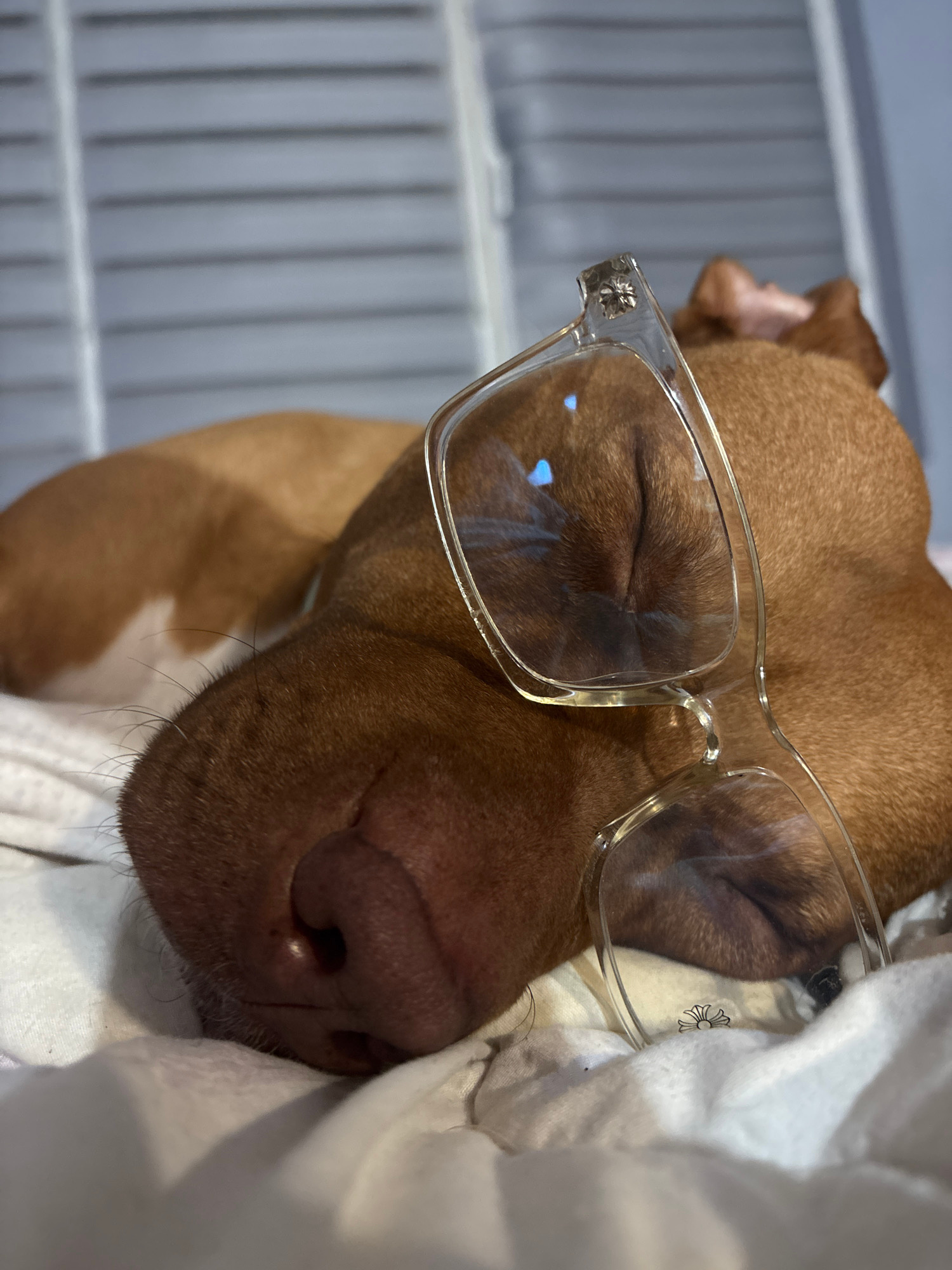 A close-up, indoor shot shows a sleeping brown dog wearing clear-framed glasses. The dog is lying on a white cloth. In the background is a white, barred structure. There is no indication of the locatiβ¦read more
