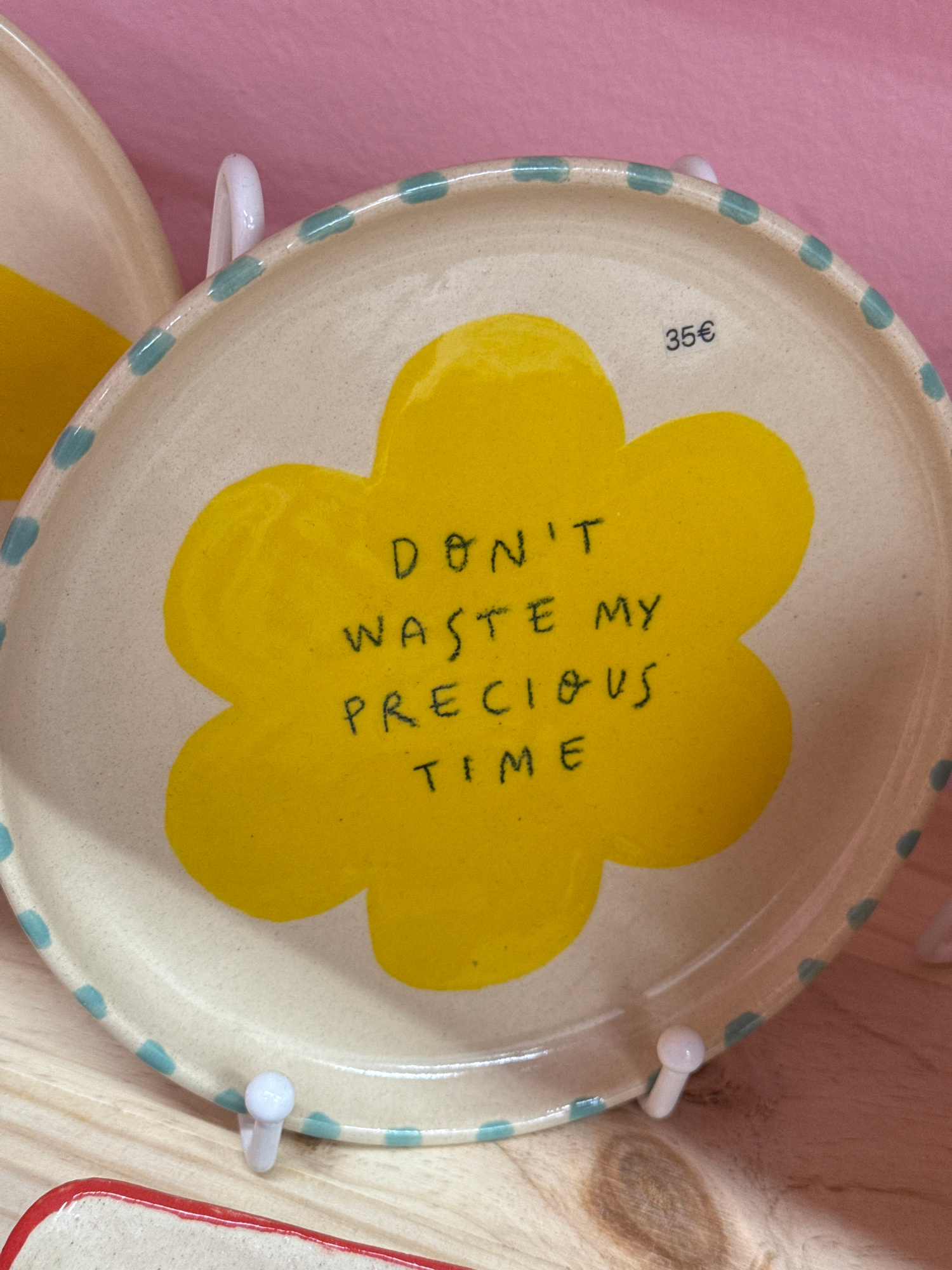 A ceramic plate is displayed on a shelf in a retail environment. The plate is beige with a blue dotted rim, and has a large yellow flower painted in the center. Hand-written in black ink, overlaying t…read more