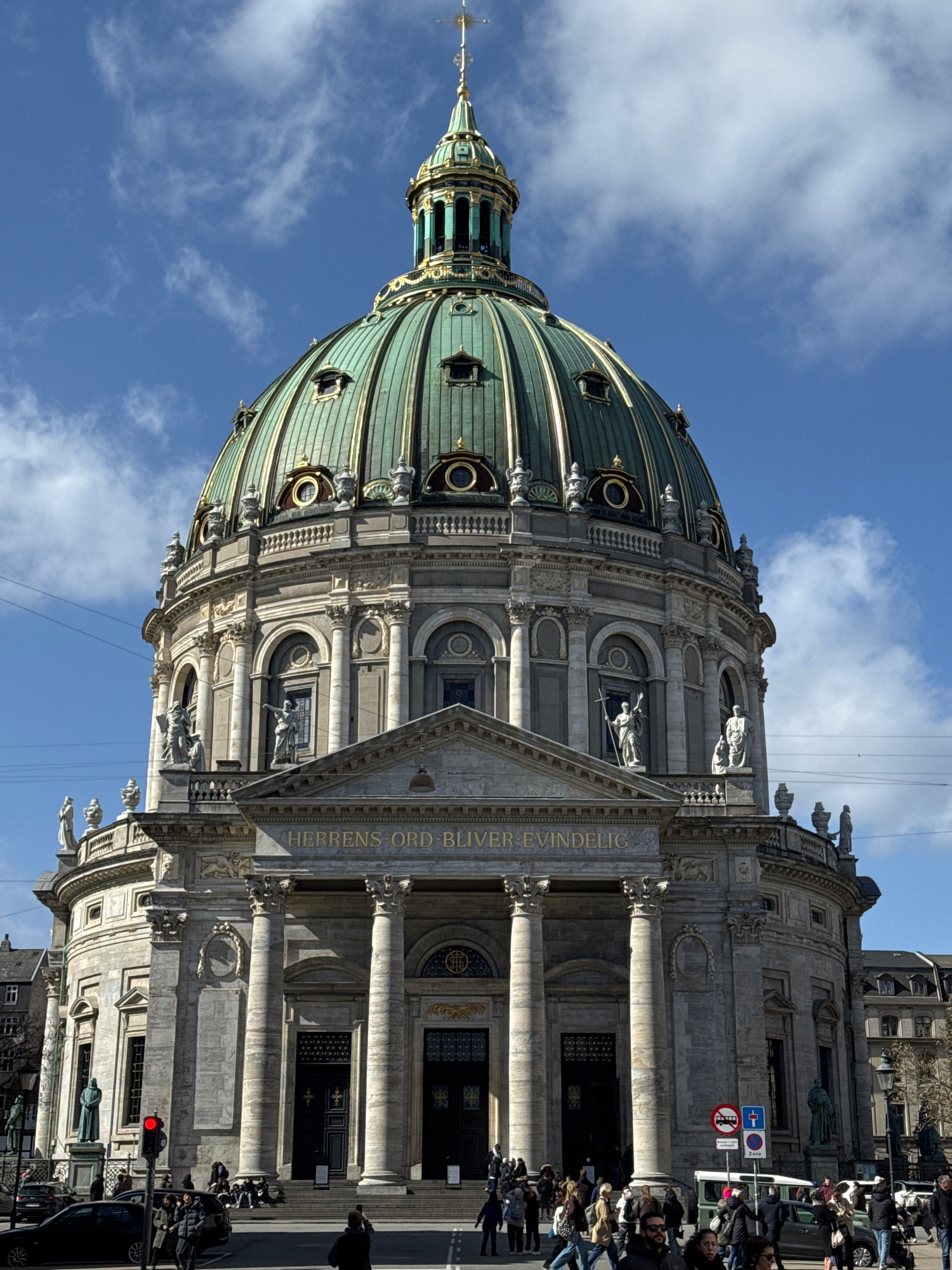 The image depicts the Marble Church (Frederik's Church) in Copenhagen, Denmark. The church's distinctive green dome dominates the left side of the image, contrasted against a blue sky with scattered c…read more