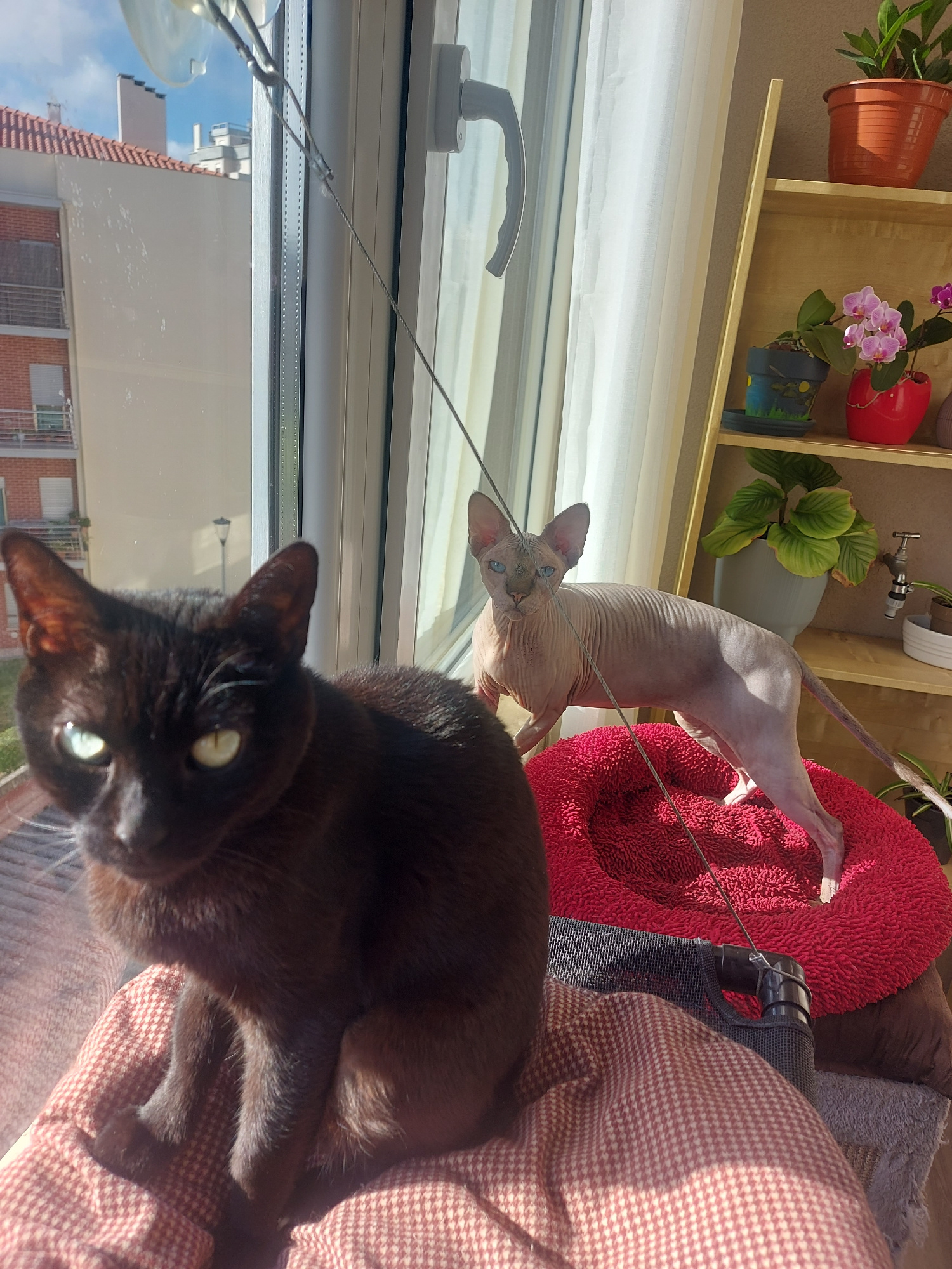 A black cat and a Sphynx cat are on a cat tree next to a window. Outside the window, a building with brick and metal trim is visible. The location is Figueira da Foz, Portugal, as determined by the bu…read more