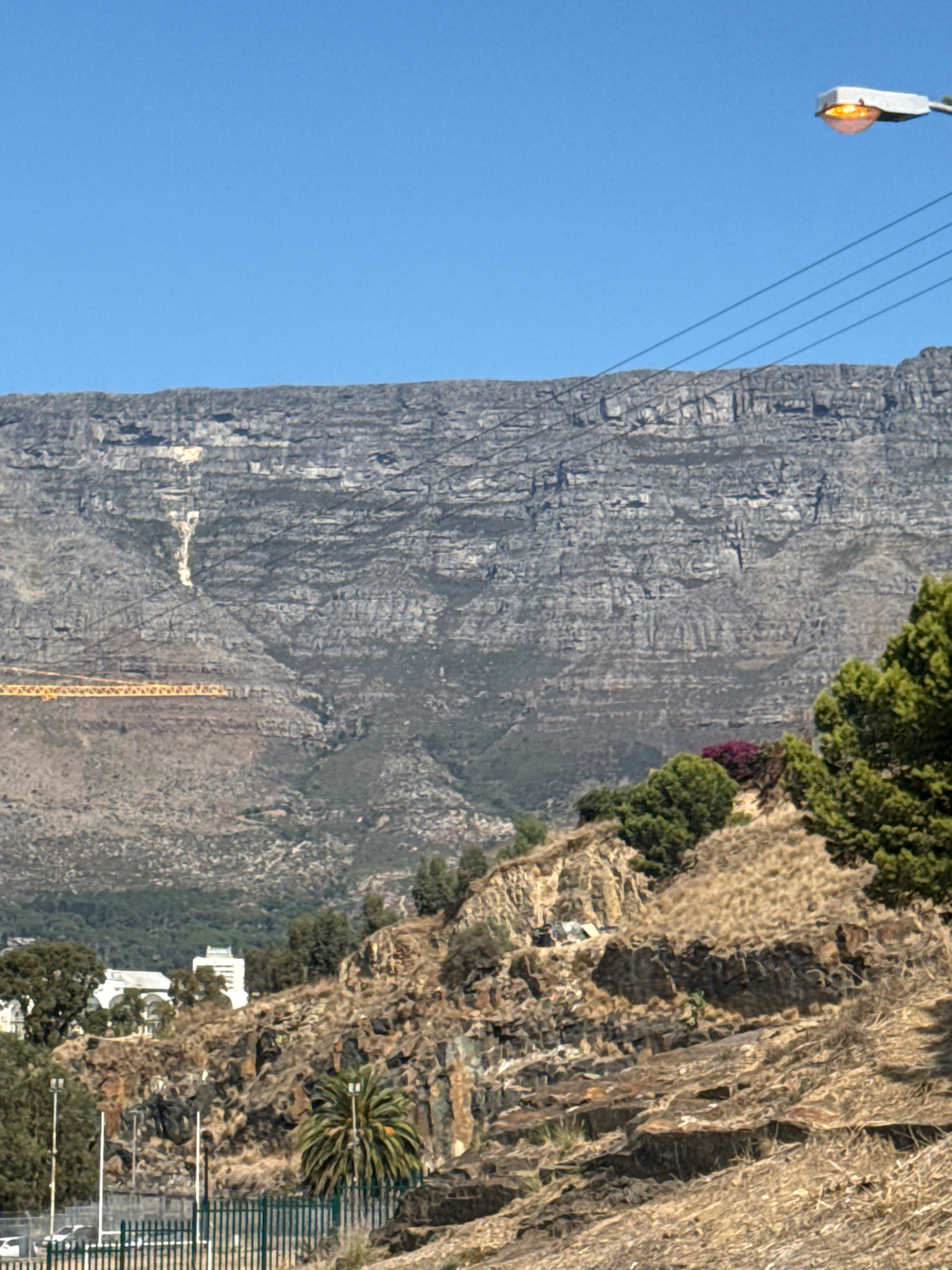 The image shows Table Mountain in Cape Town, South Africa, with a clear blue sky in the background. A cable car wire stretches diagonally across the image, and a light hangs from it at the top left co…read more