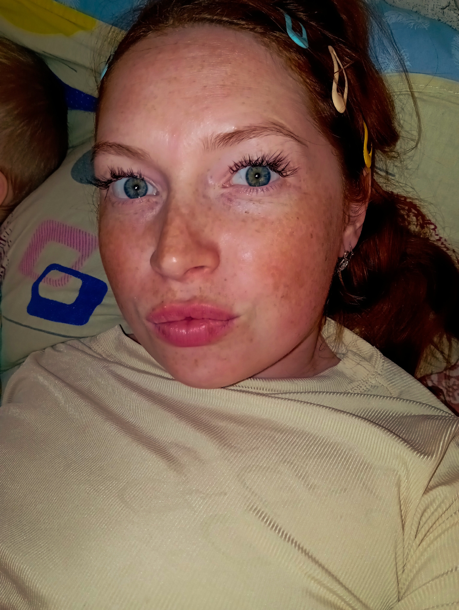 A close-up, tilted, indoor shot shows a woman with light skin and many freckles, lying down. Her hair is predominantly red-brown, with hair clips in blue, yellow, and white visible. She has blue eyes.…read more