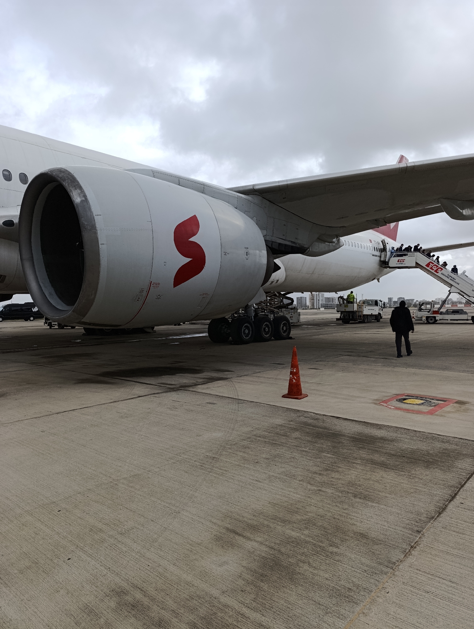 The image depicts the side of a large passenger airplane on an airport tarmac, with passengers disembarking via a mobile stairway labeled "TGS GROUND SERVICES" in English and Turkish. A red "S" logo i…read more