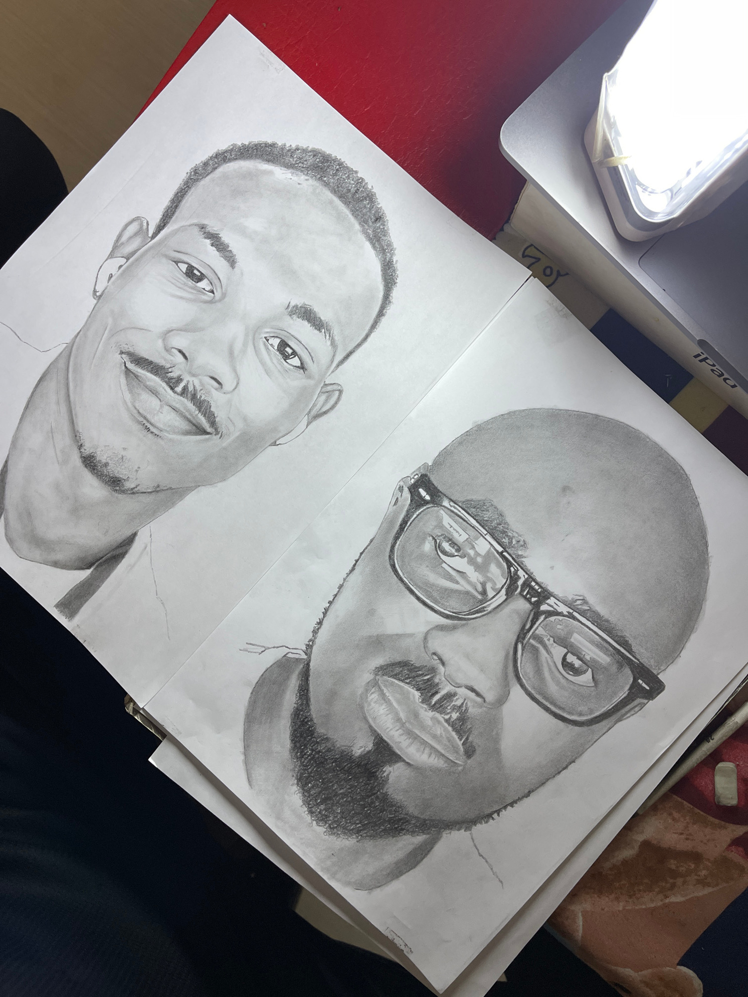 Two pencil portraits on white paper are positioned side-by-side on a table. The portrait on the right depicts a bald man with a beard, wearing glasses. The portrait on the left is of a younger man wit…read more