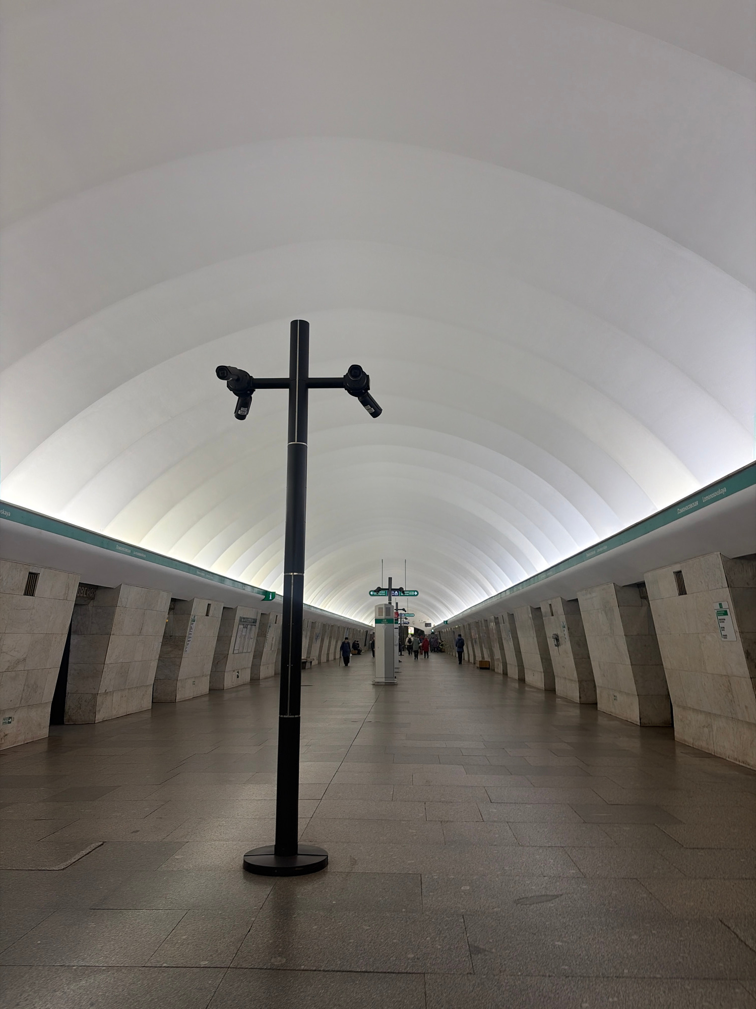 The image shows a platform in the Admiralteyskaya metro station in Saint Petersburg, Russia. The station has a distinctive architectural design with a large, arched ceiling. A black metal structure w…read more